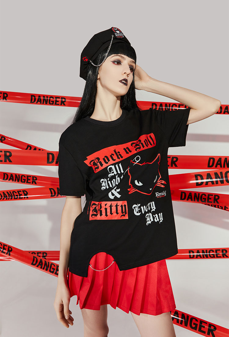- Black relaxed fit unisex Emily the Strange T-shirt featuring All Night and Kitty Every Day print, cutout at hem, and metal chain attached at the bottom