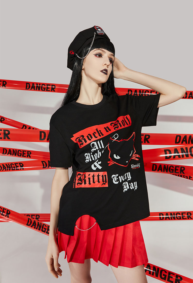 - Black, red French-style Beret featuring Emily logo at front, Kitten paw embroidery at right side, and chain attached between these two logos adding a touch of strangeness