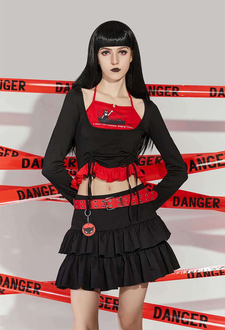 [Officially Licensed] Emily The Strange Micotaku High Waist Casual Double Layered Skirt Women Black Red Daily Wear