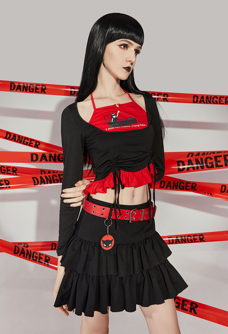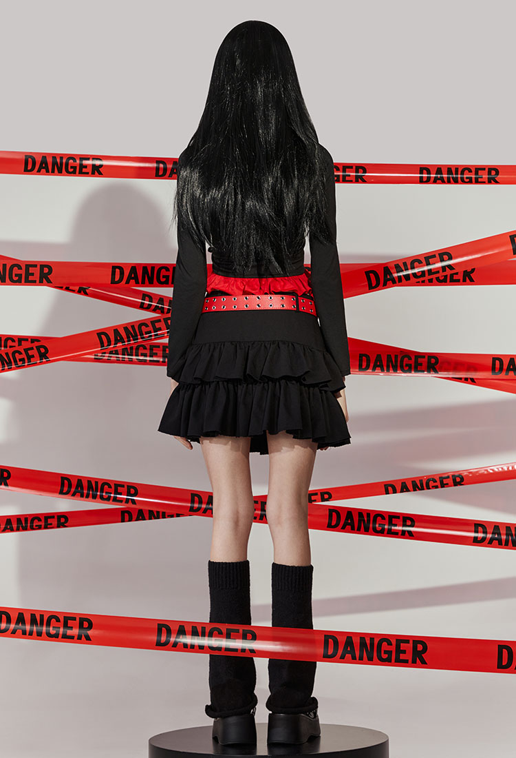 - Black, red high waisted casual double layered skirt featuring contrasting color belt, and kitten rubber seal accessory attach to the belt
