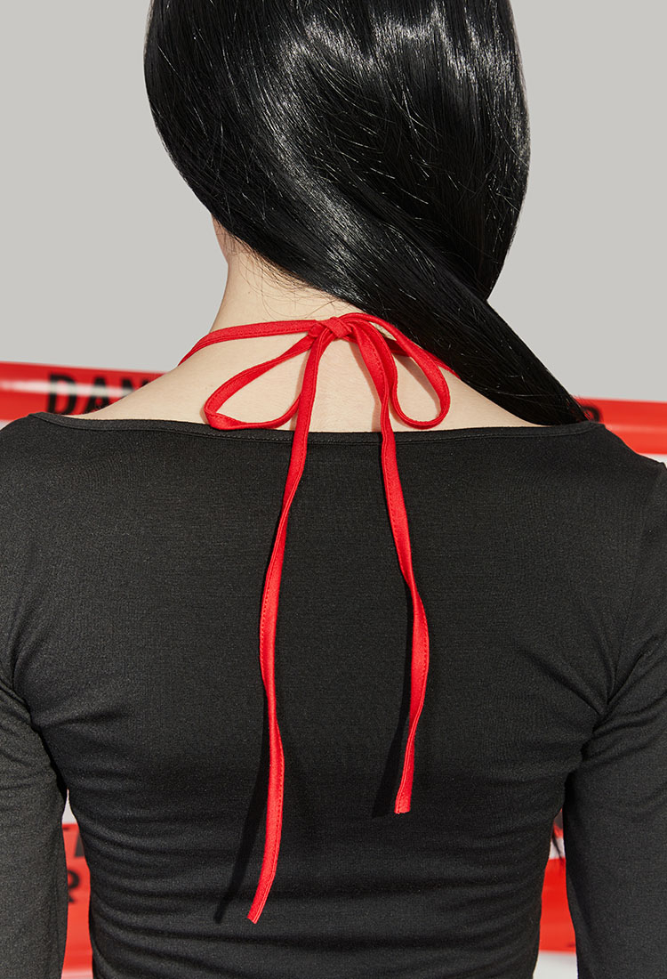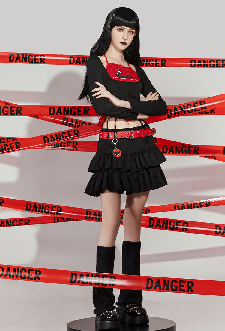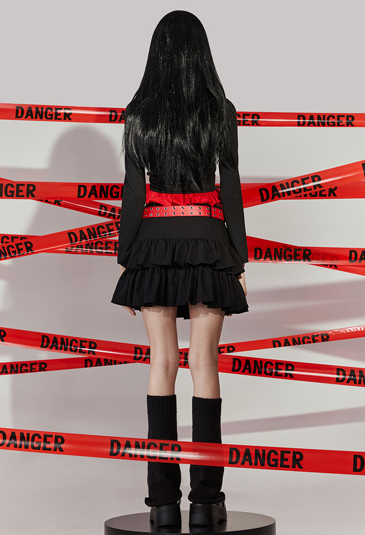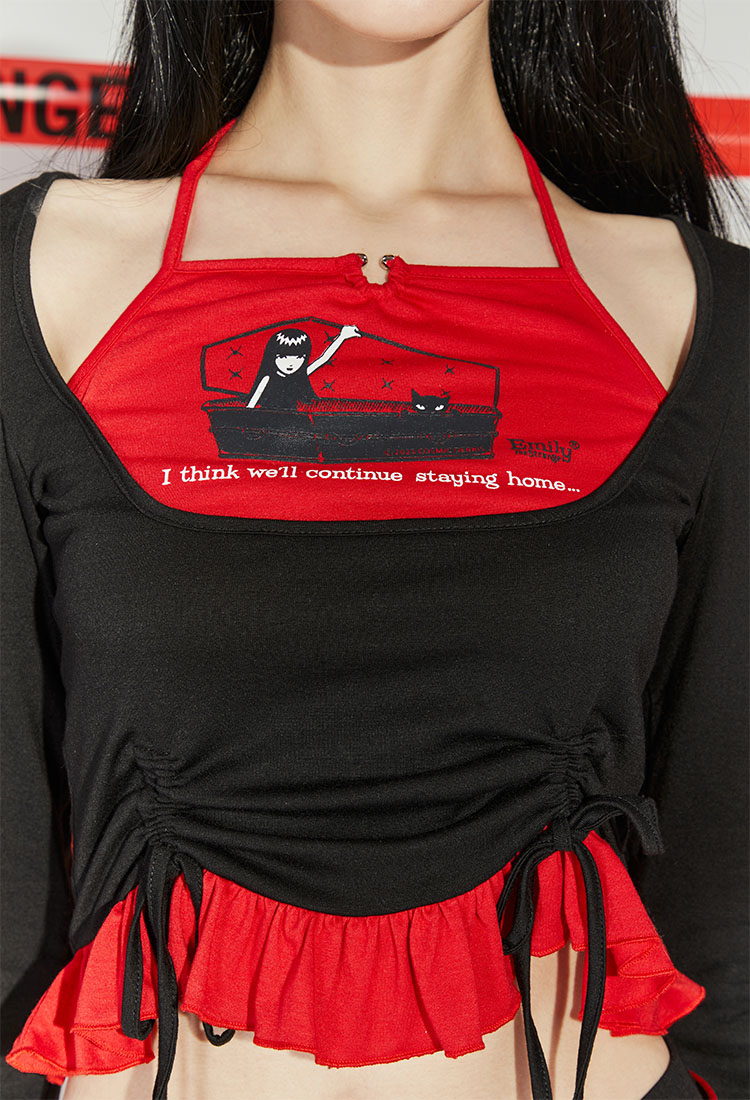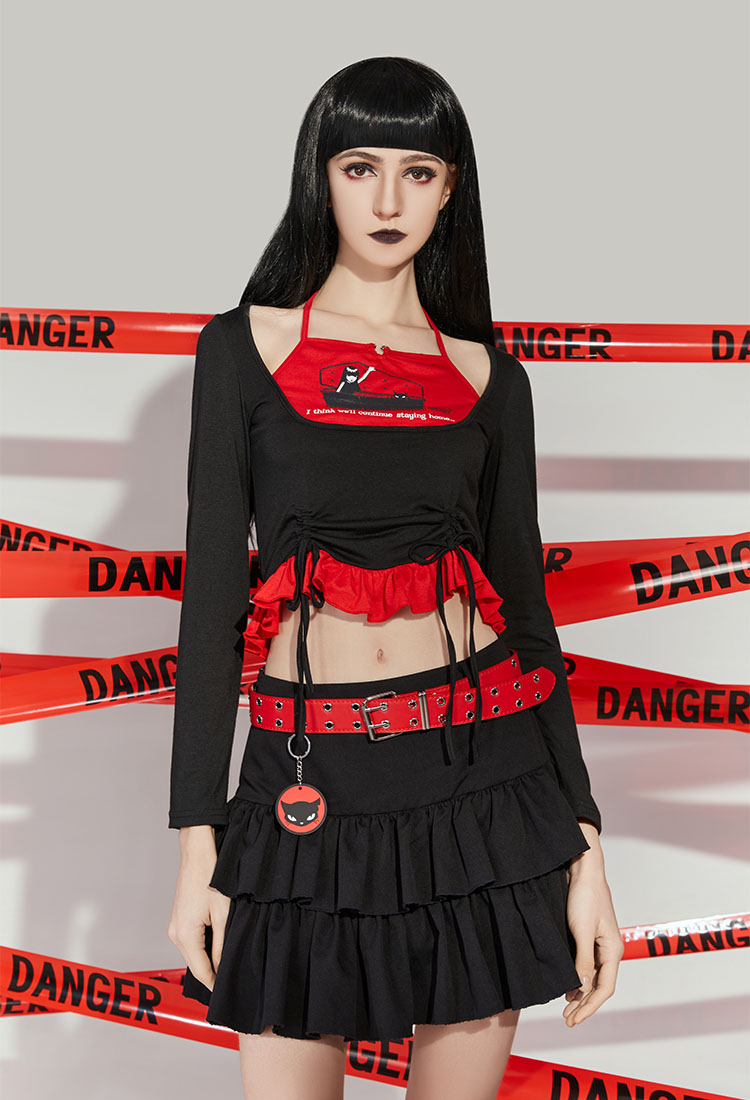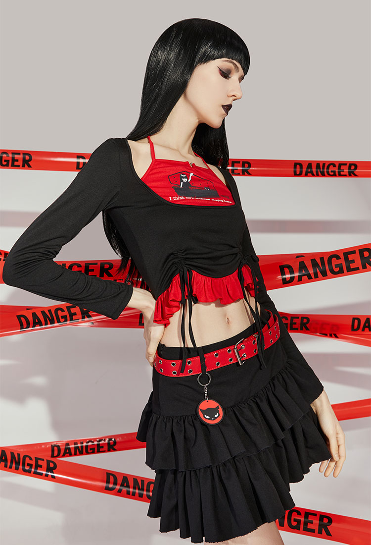 - Black, red slim fit crop top featuring contrasting color design, drawsrting at waist and ruffles at hem adding a touch of cuteness and hotness