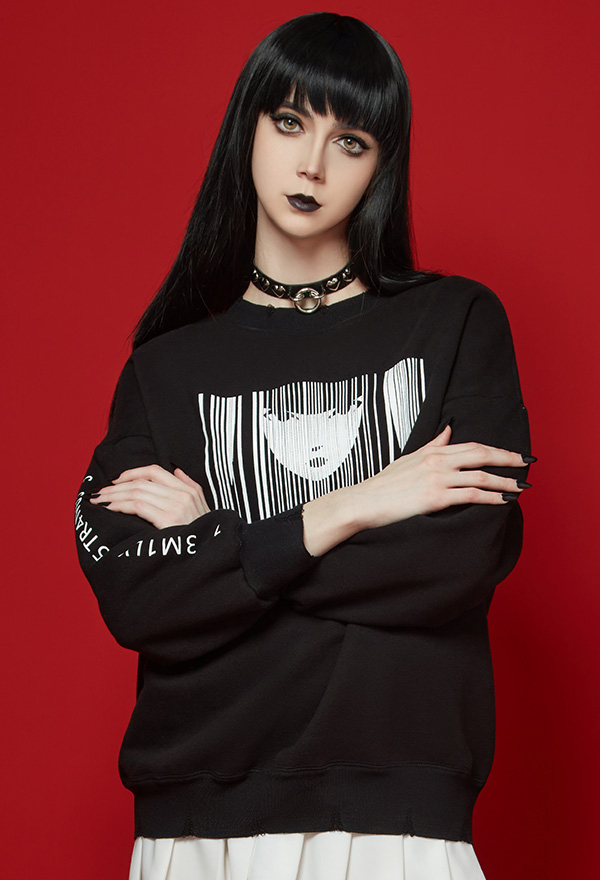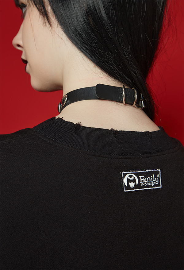 [Officially Licensed] Emily the Strange Dark Pieces Print Frayed Hem Long Sleeves Pullover Sweatshirt