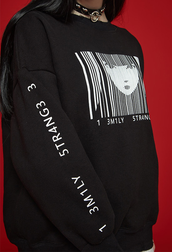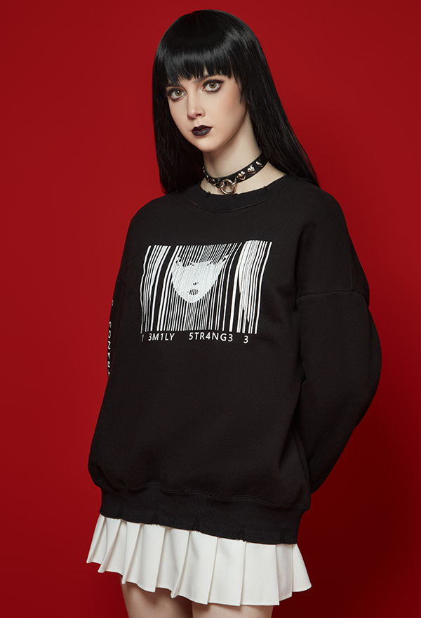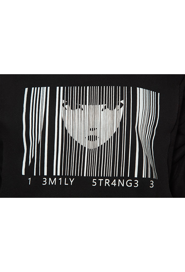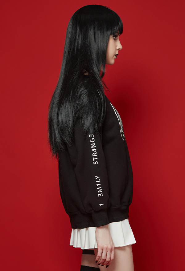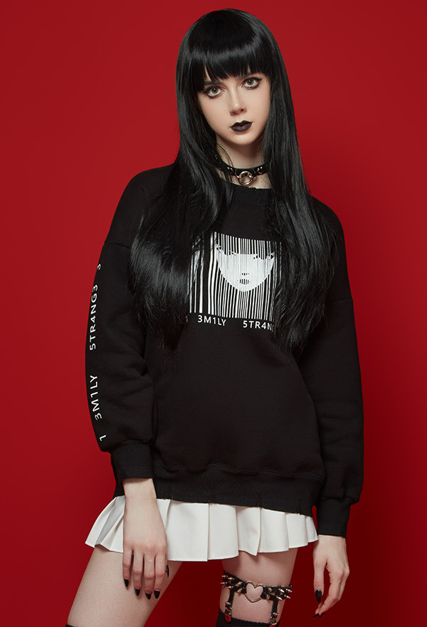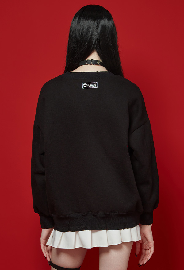 - The sweatshirt features secret black color, unique stylish frayed hem and dark pieces of Emily print on the front