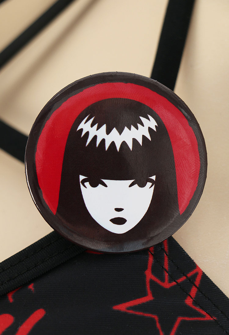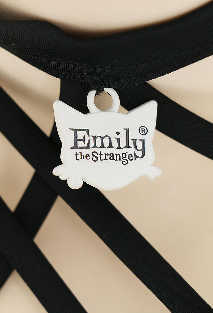- The top features a halter-neck design, a black cat pendant on the neck strap, pentagram straps, stylish Emily print and a classic bikini cut.