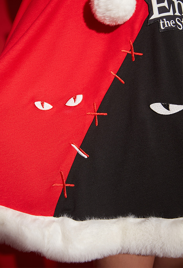 - The hooded costume features cute black cat hat, striped pattern, plush hem, and cat eyes on the front.