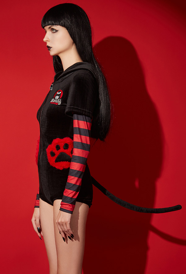 [Officially Licensed] Emily the Strange Striped Sleeves Paw Bags Zipper Cat Halloween Romper Pajama