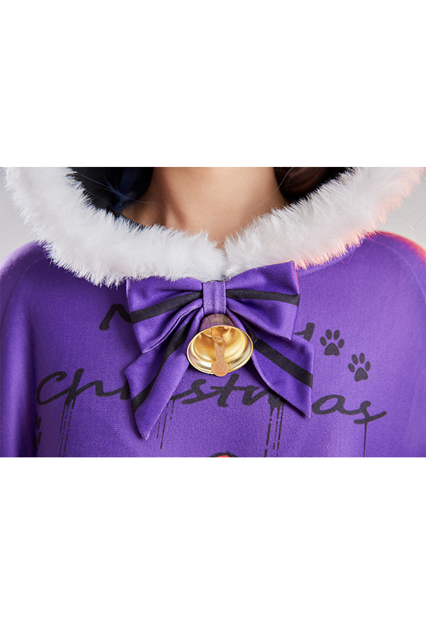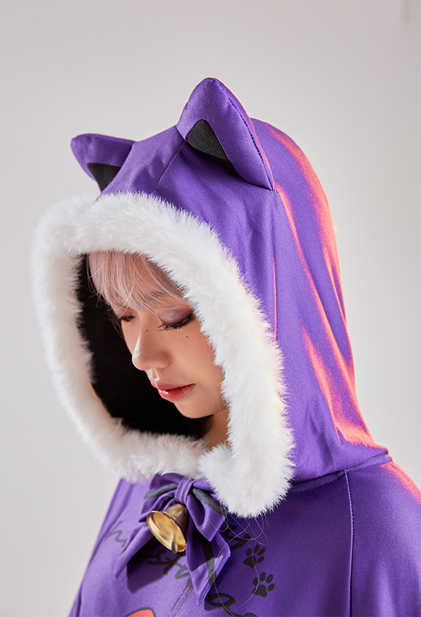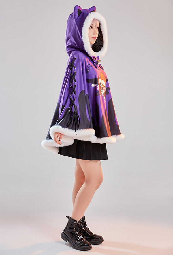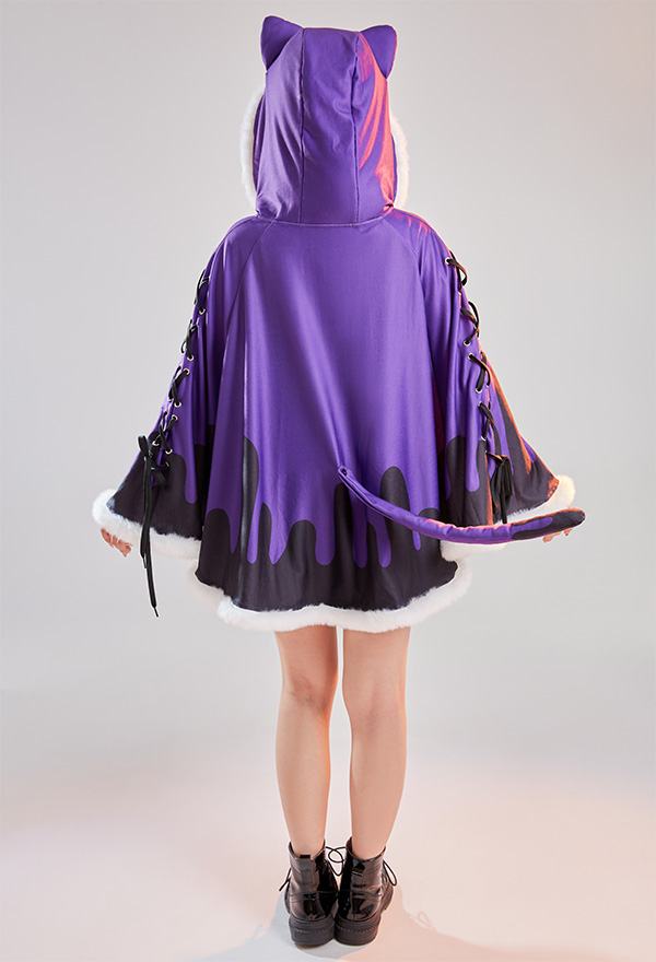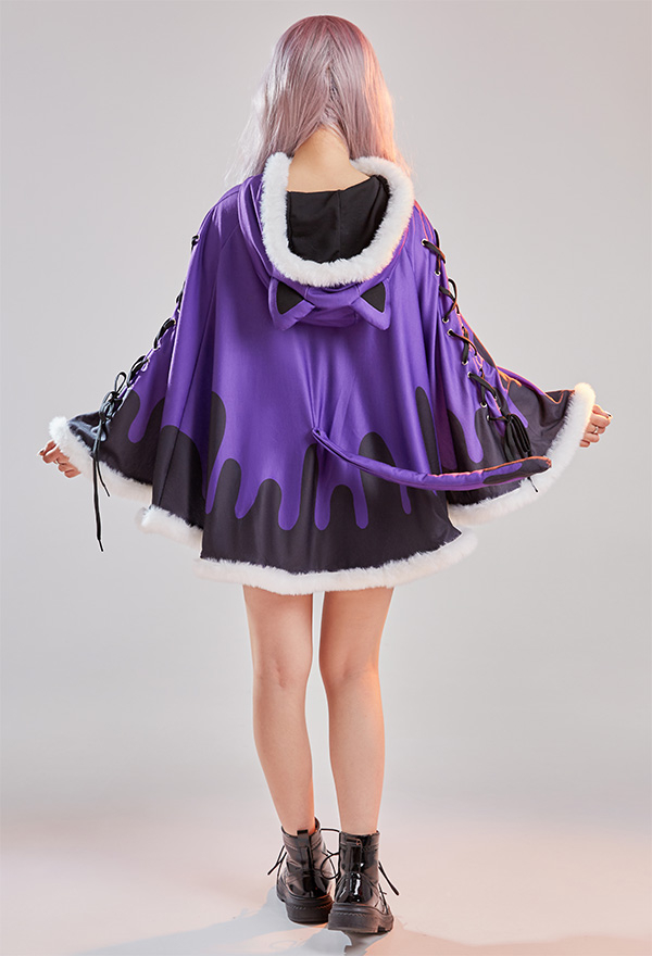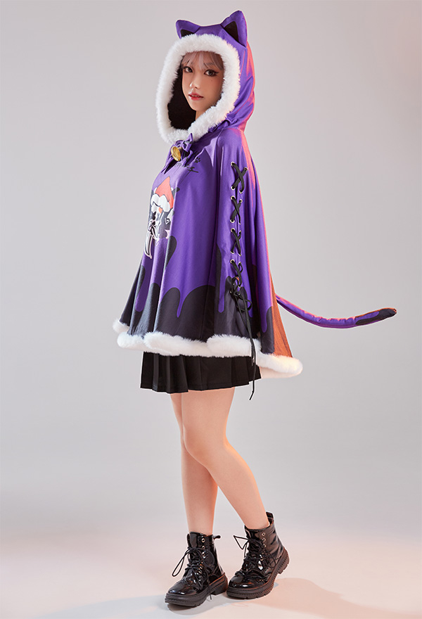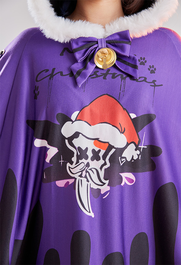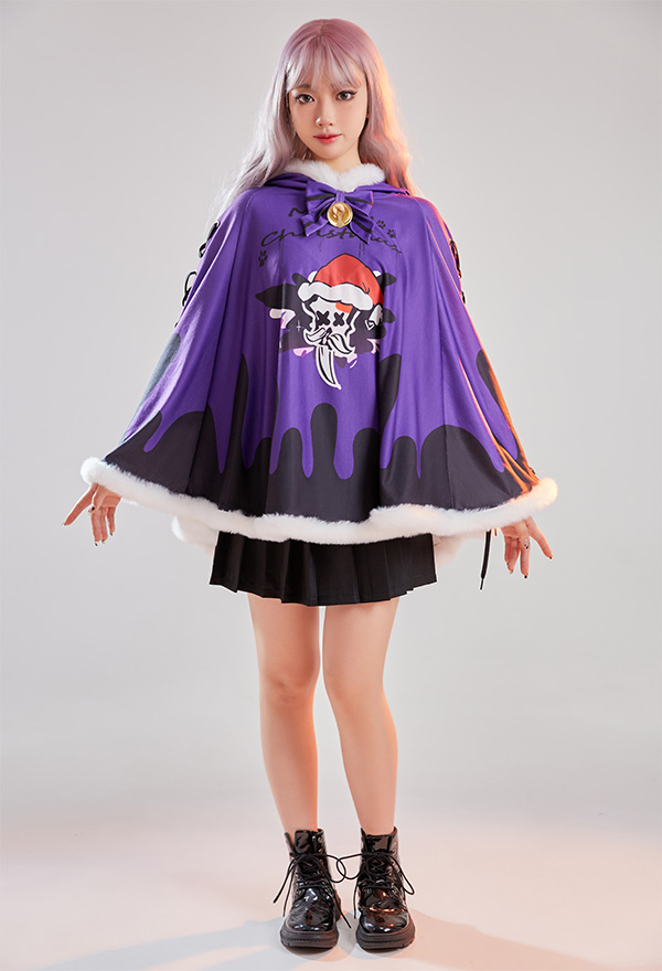 - Design details: It features hooded cape with dark santa claus pattern. The black purple contrast color shows the vibe of gothic Christmas. Adorable fluffy trim will definitely keep you warm!