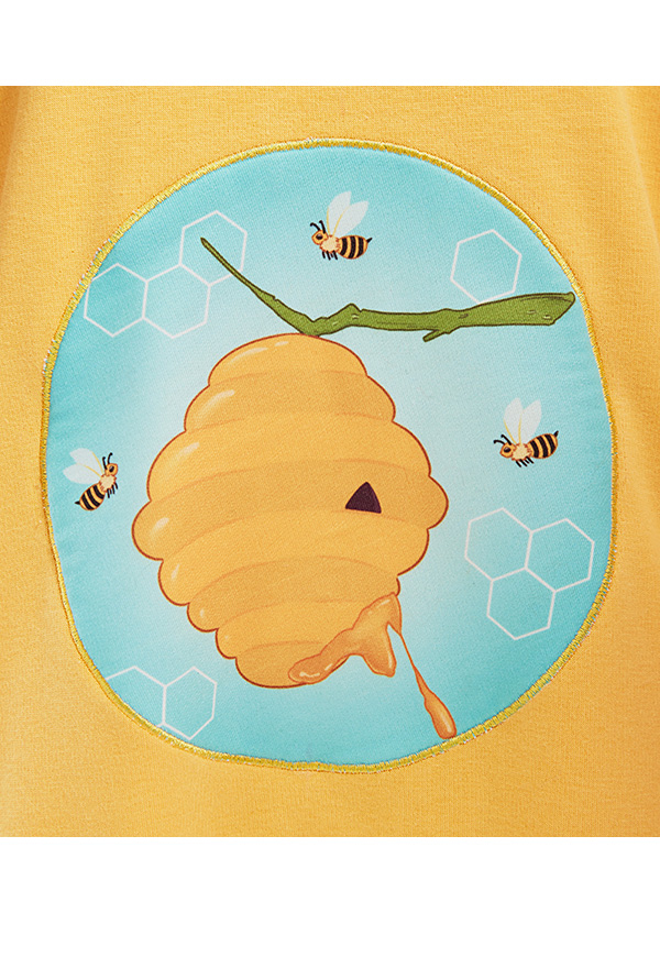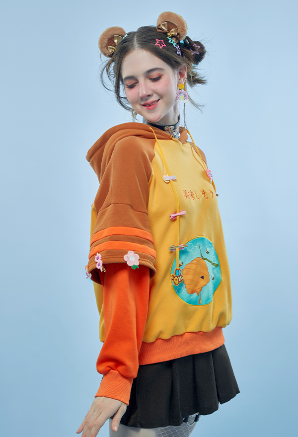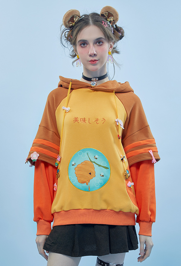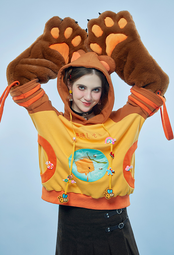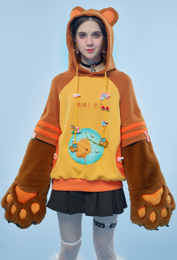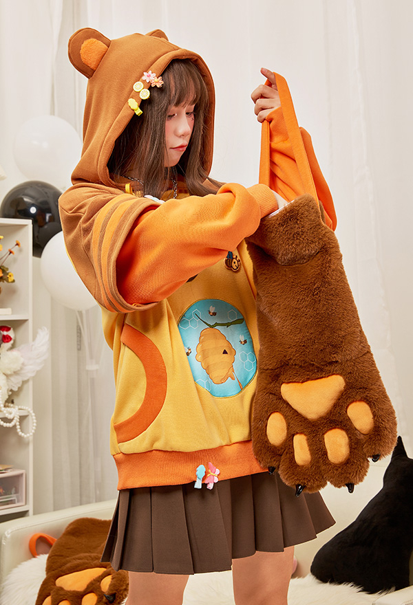 Honey Bear Graphic Pullover Hoodie Cute Style Brown Bee Pattern Hoodie with Furry Cat Paw Gloves