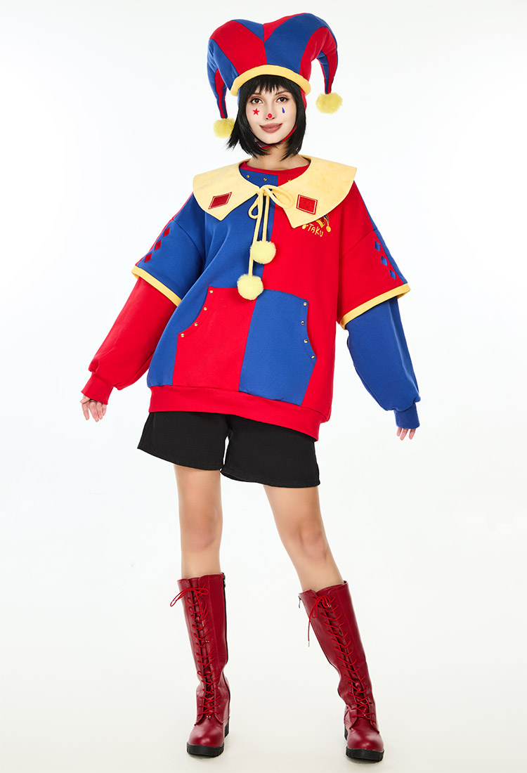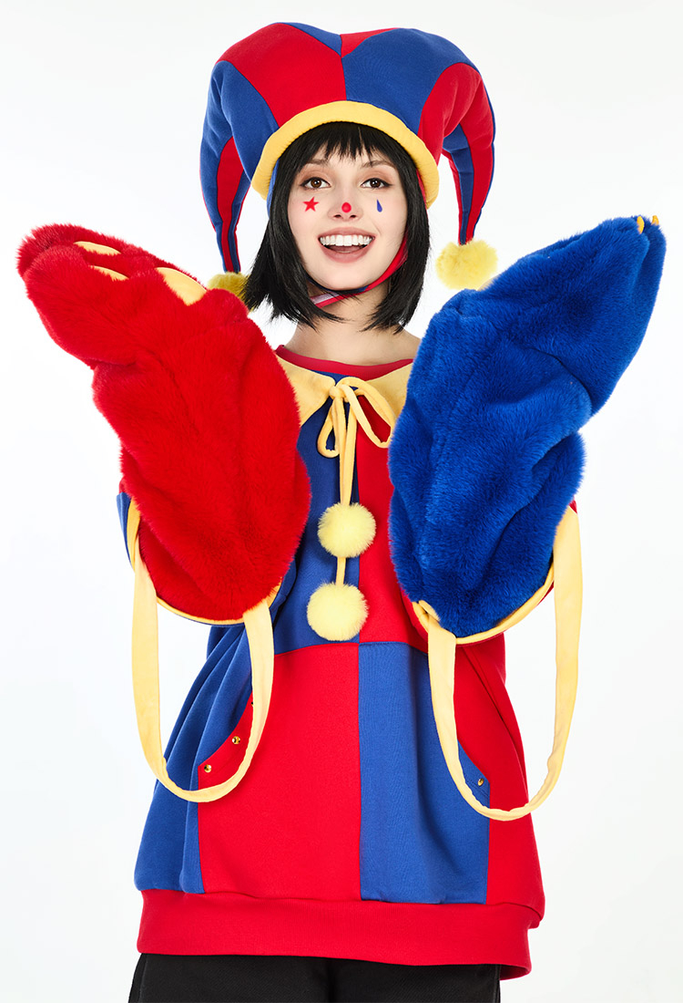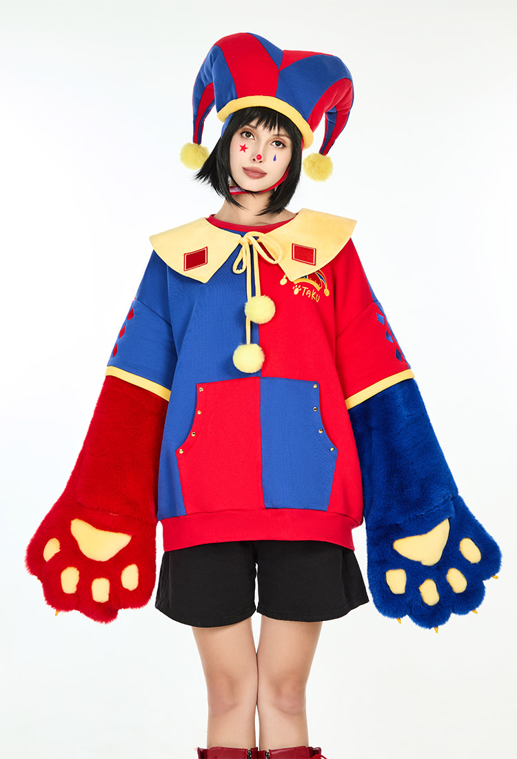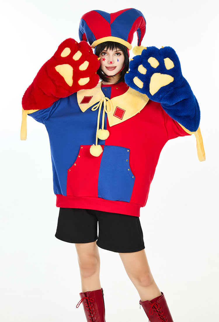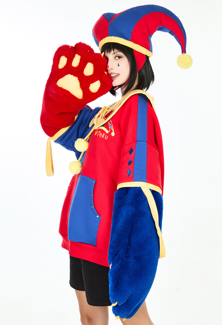 - Micotaku Clown Design Paw Hoodie using red and blue color matching, with some yellow contrasting colors.