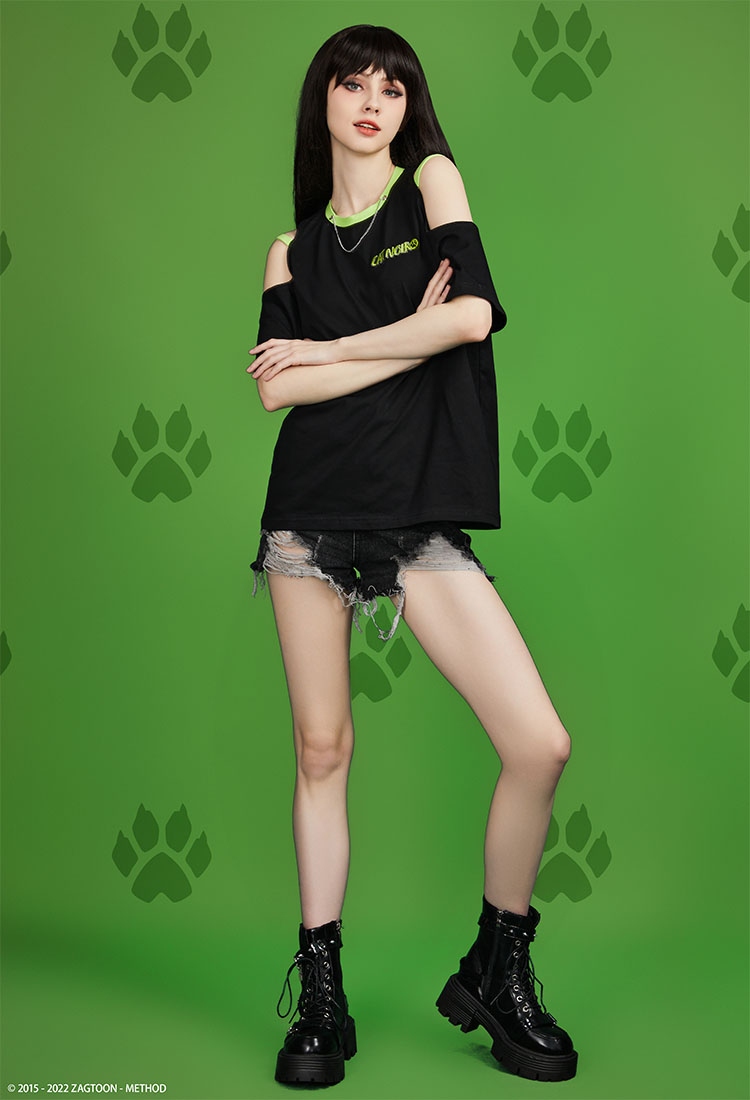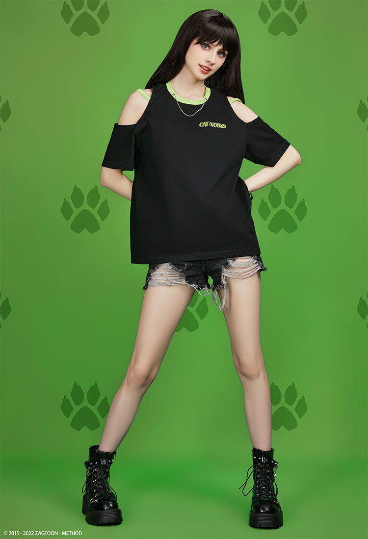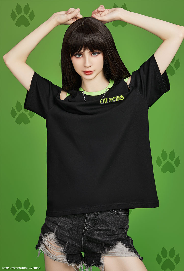 - This officially licensed tee features a striking black and green print that showcases Cat Noir in action. With a unique cut-out design on the shoulders, this shirt is a perfect blend of style and comfort.