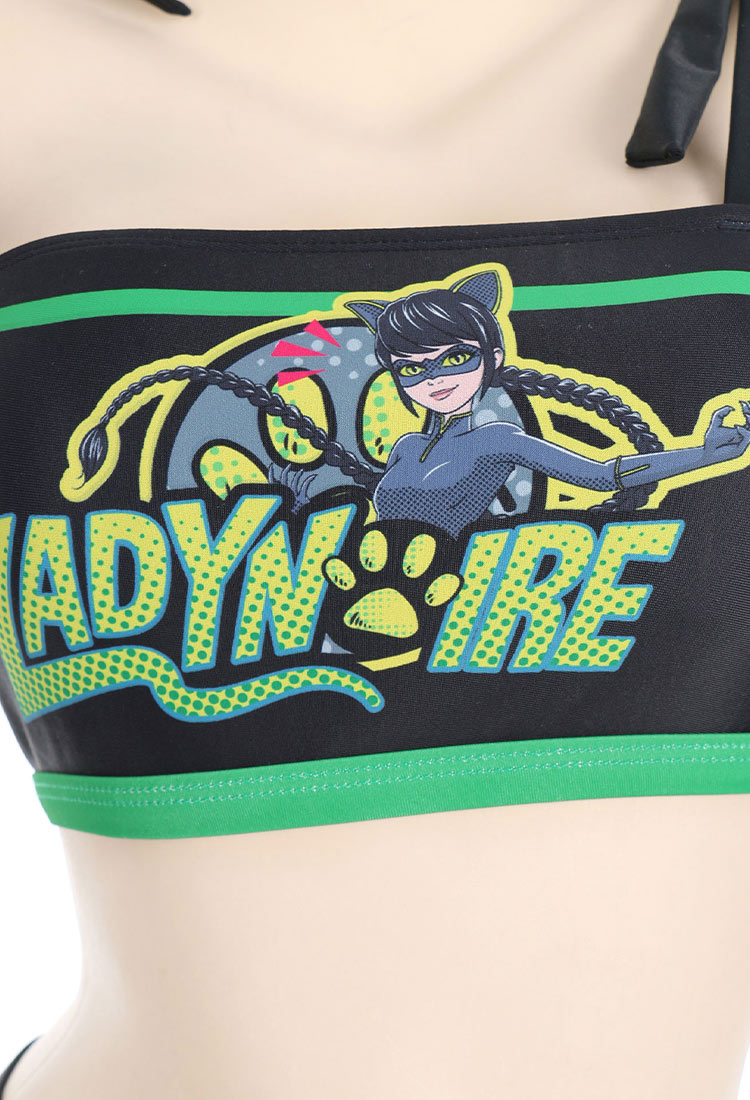 Officially Licensed Miraculous Lady Noir Bikini Set | Women's Black and Green Tie-Front Swimsuit