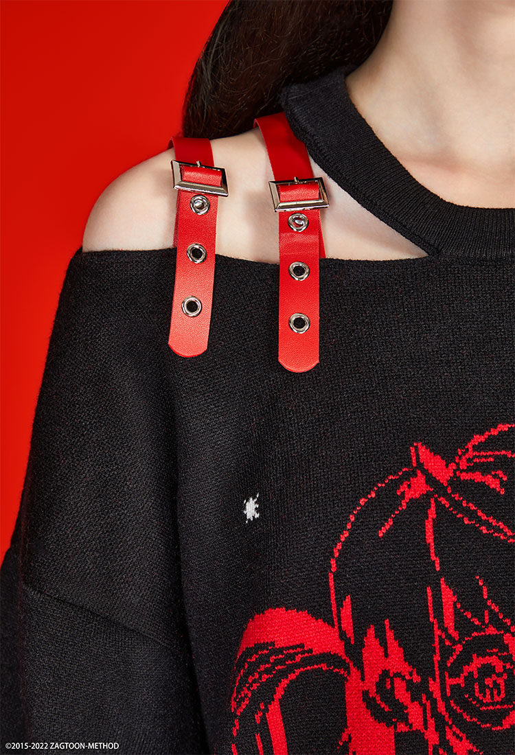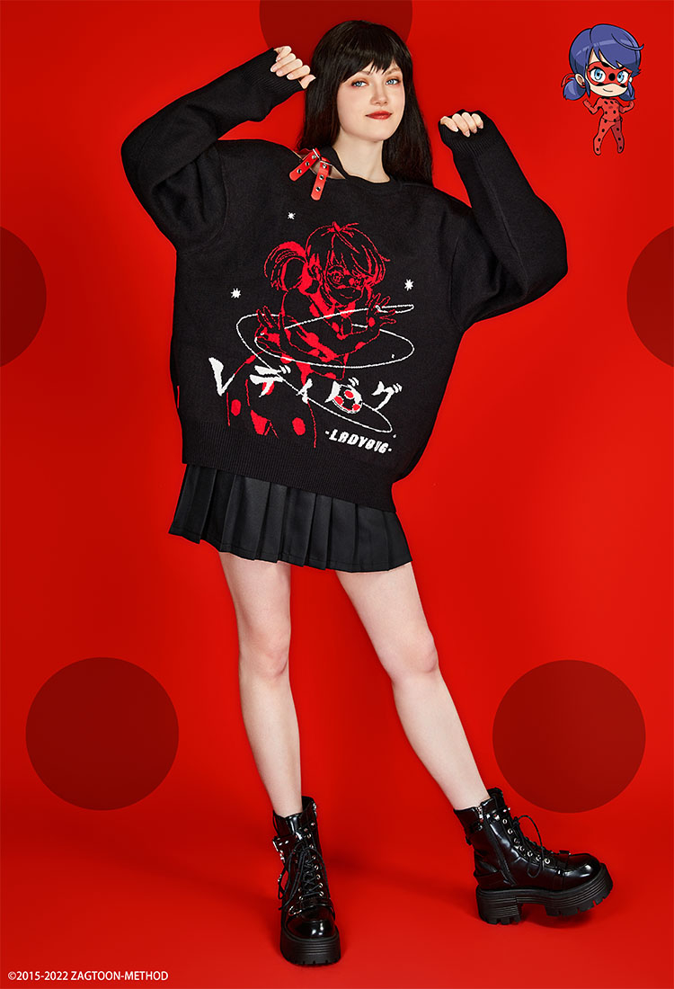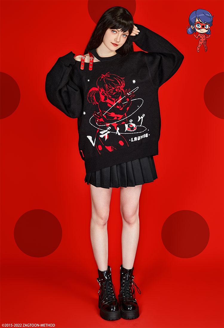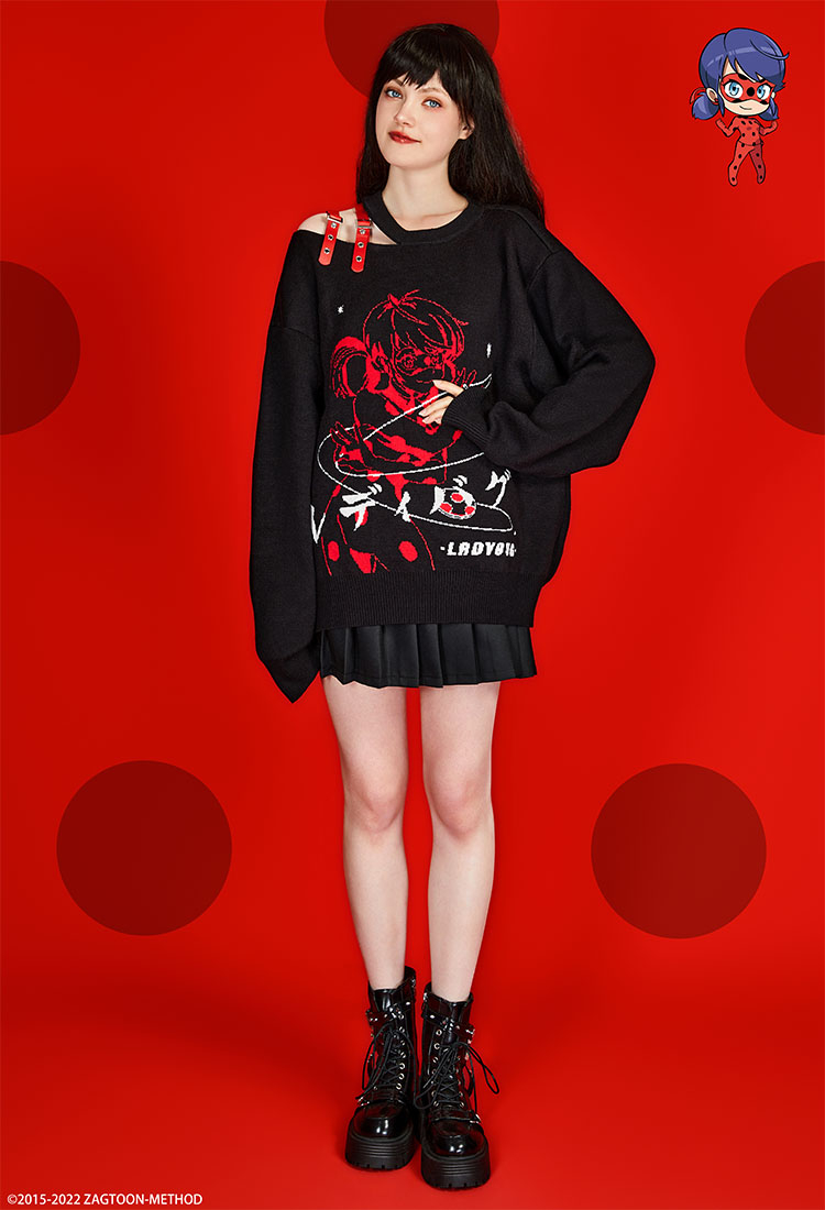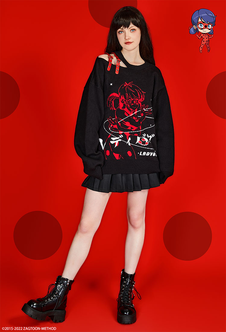 - Get cozy and stylish with our Miraculous Ladybug Sweater! This trendy sweater features a unique one-shoulder design and is adorned with adorable Ladybug prints inspired by the iconic character, Marinette.