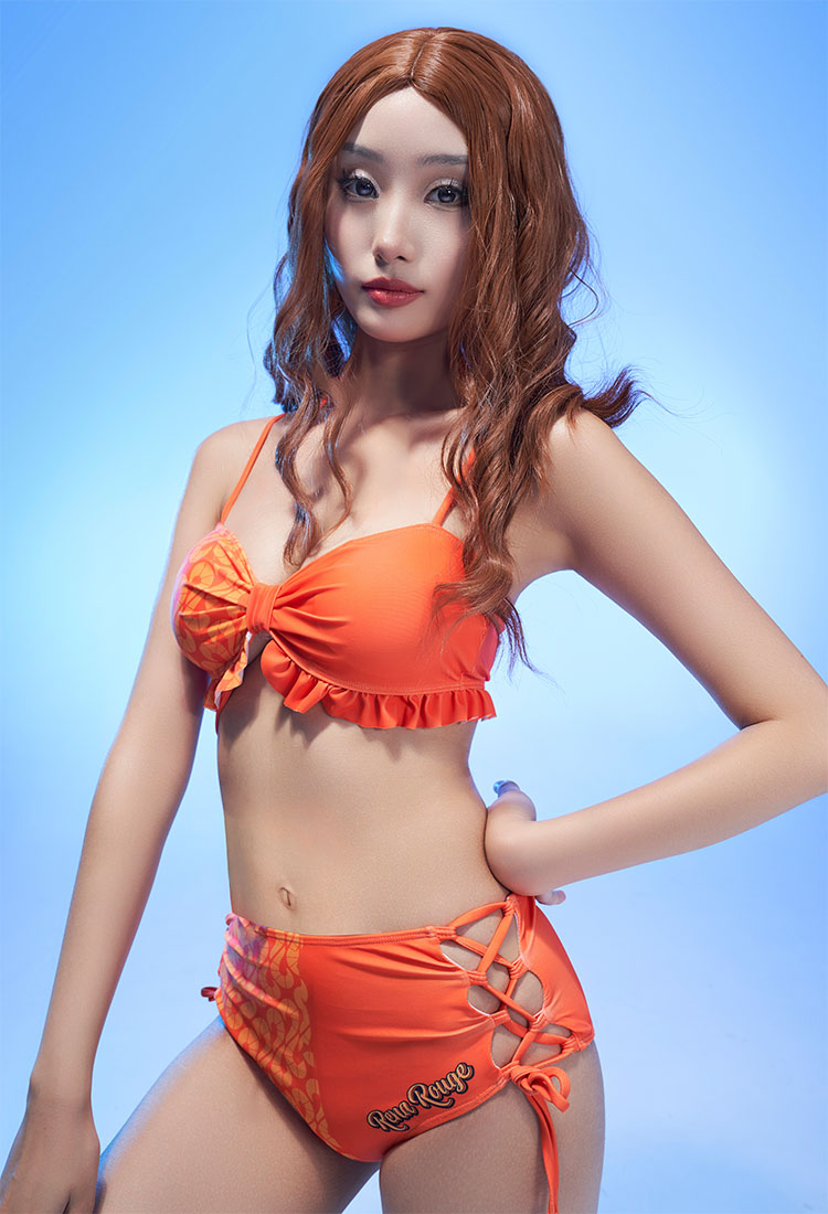 - This bathing suit features a bright and bold orange color, lace-up high waisted bottom and stylish print.