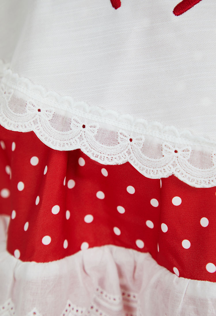 - Paired with an exquisite apron, adorned with embroidery/printing techniques, intricate decorations on the garment, complemented by a strawberry beret , a neck accessory and socks.