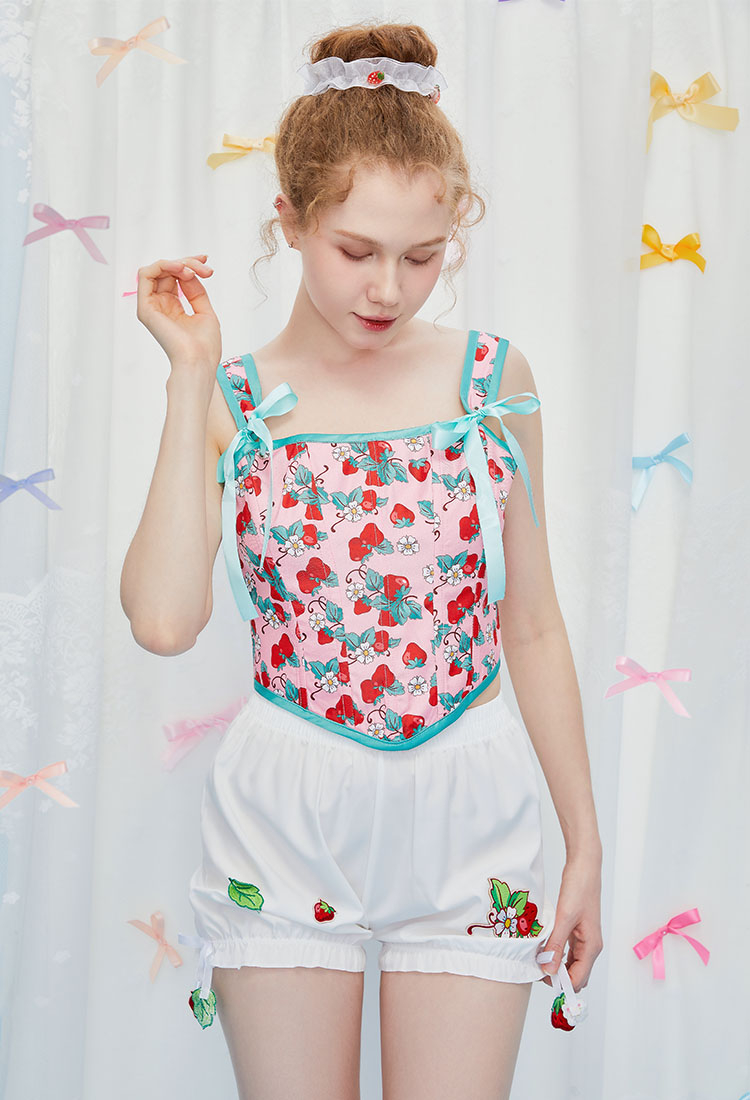 - This corset top is designed to accentuate the curves of every woman, providing a flattering silhouette. Crafted with a unique vintage-inspired strawberry print, this top is all about embracing femininity