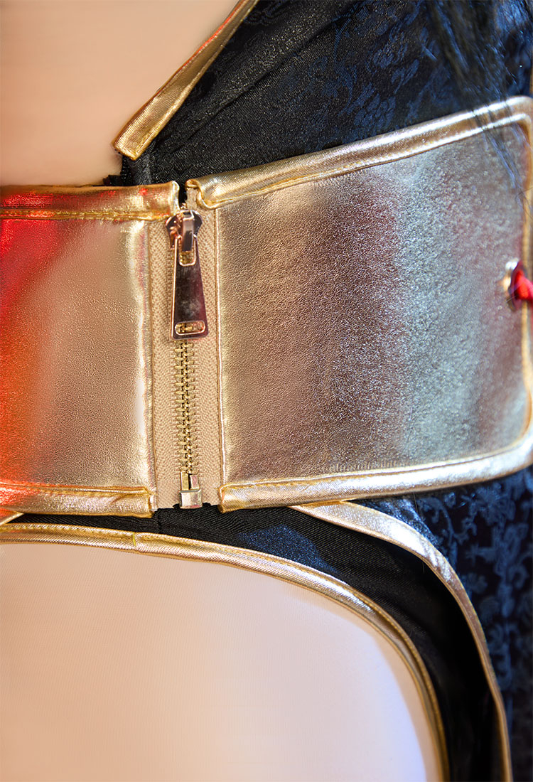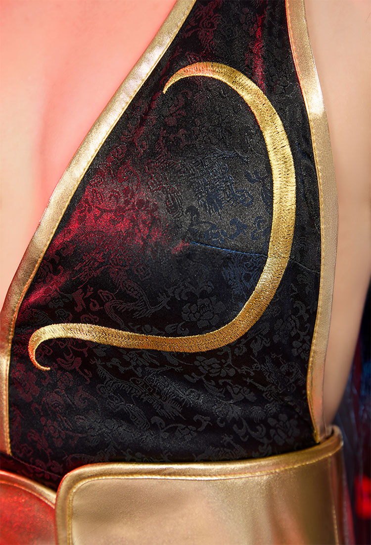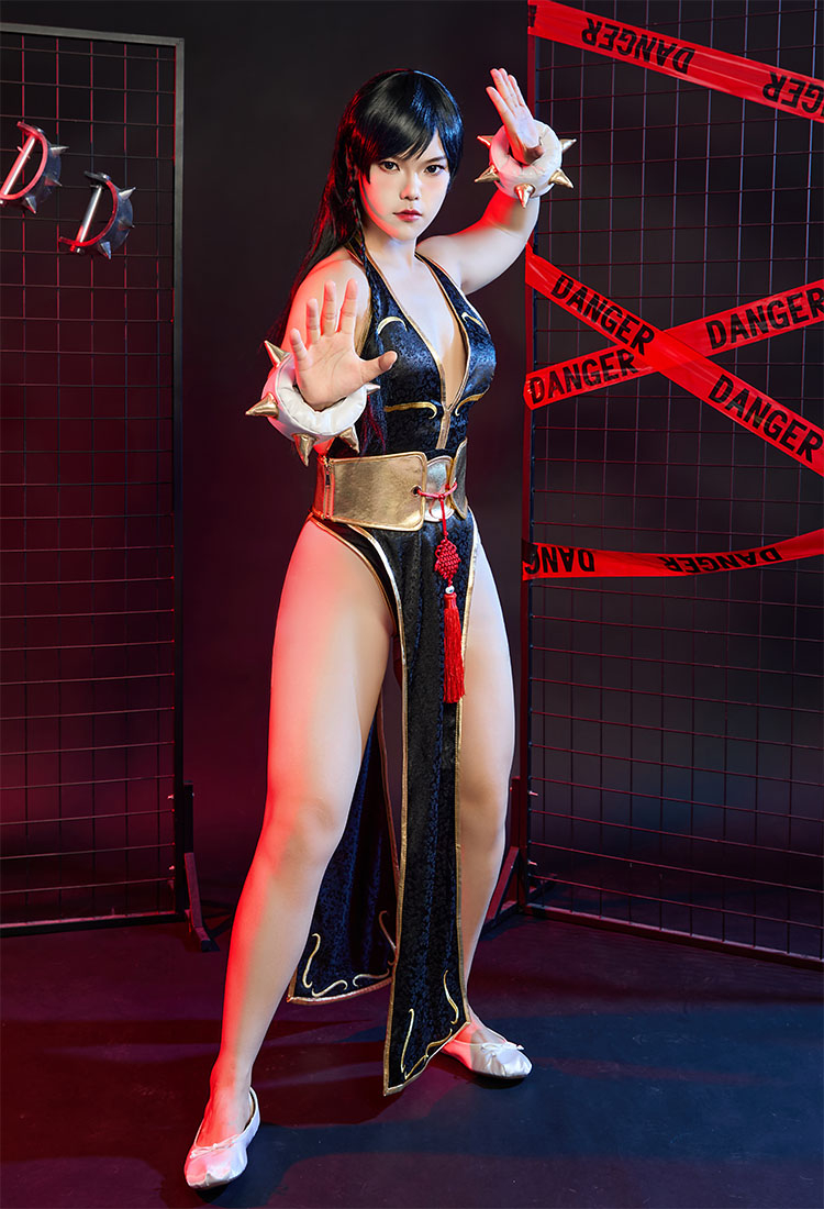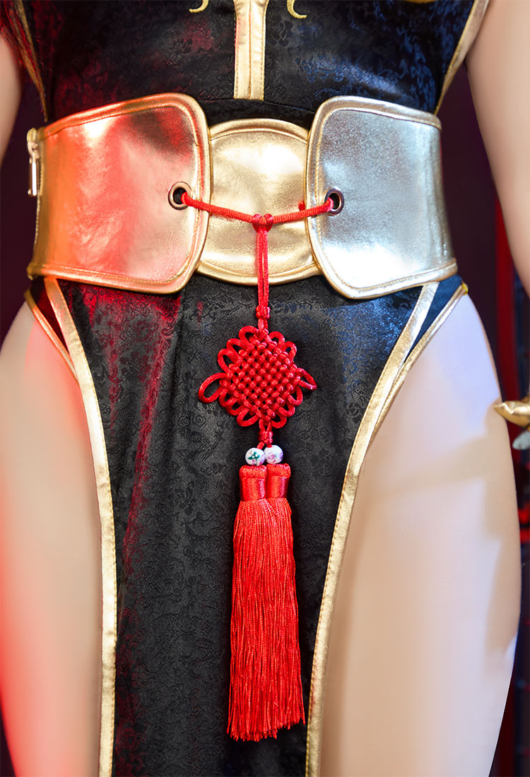 This costume features a sleek black qipao with side slits, capturing Chun-Li's fierce yet graceful essence.The attention to detail in the design ensures authenticity and a striking resemblance to the classic character from the Street Fighter series.