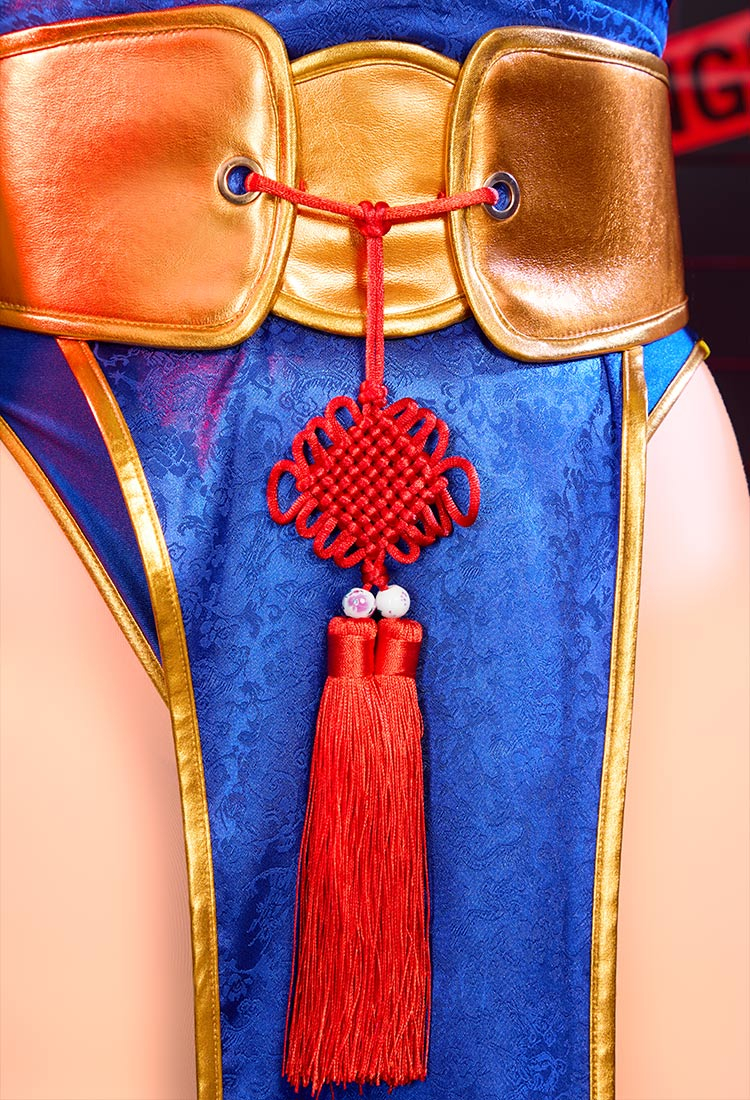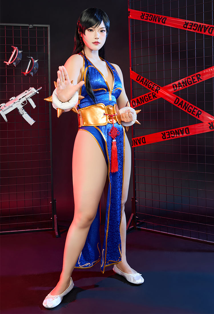 - This costume features a sleek blue qipao with side slits, capturing Chun-Li's fierce yet graceful essence.