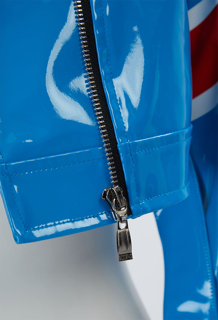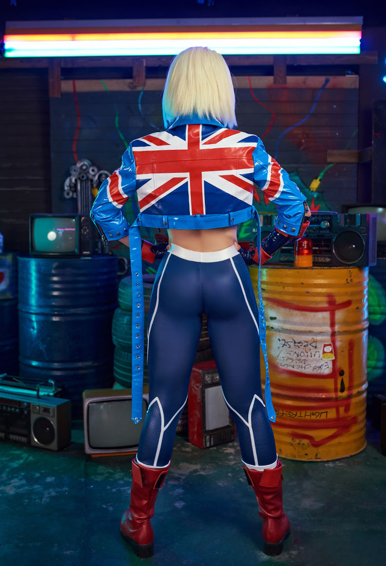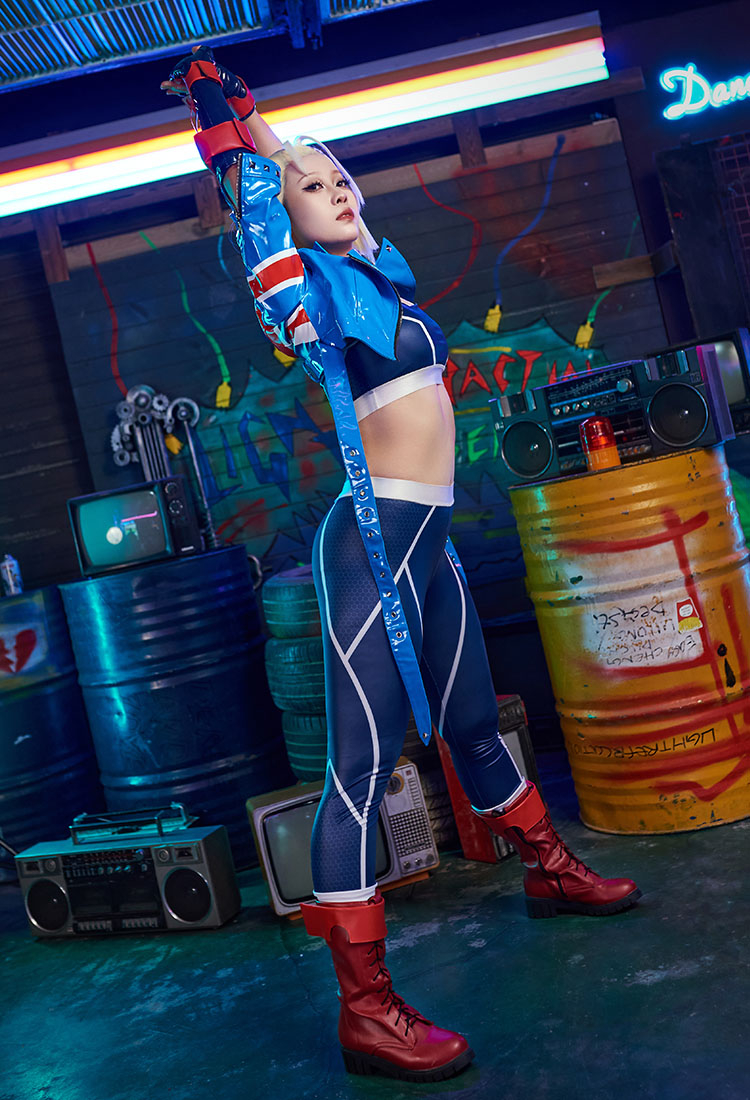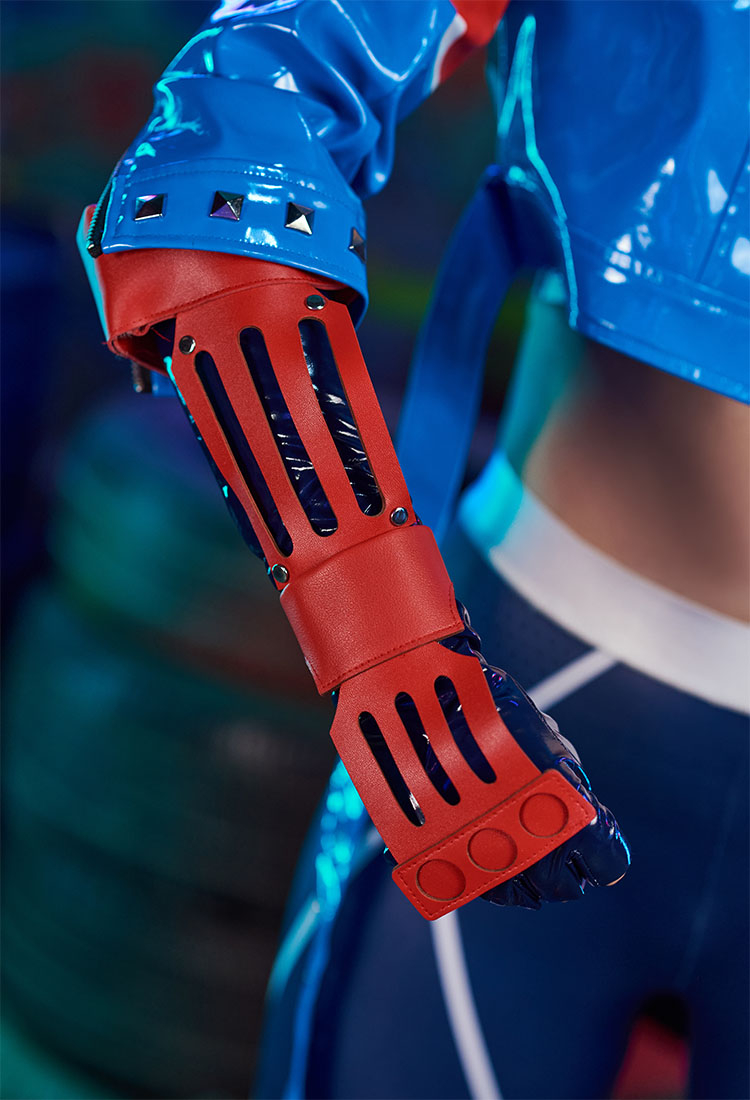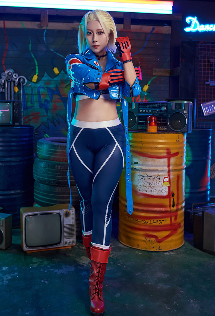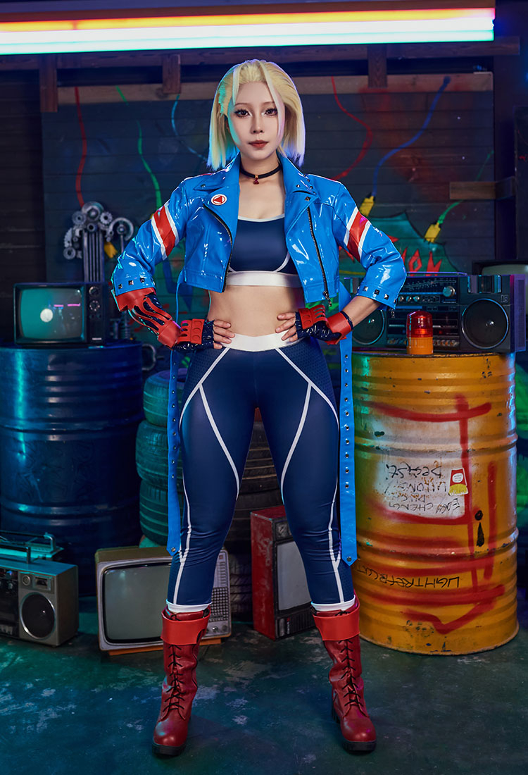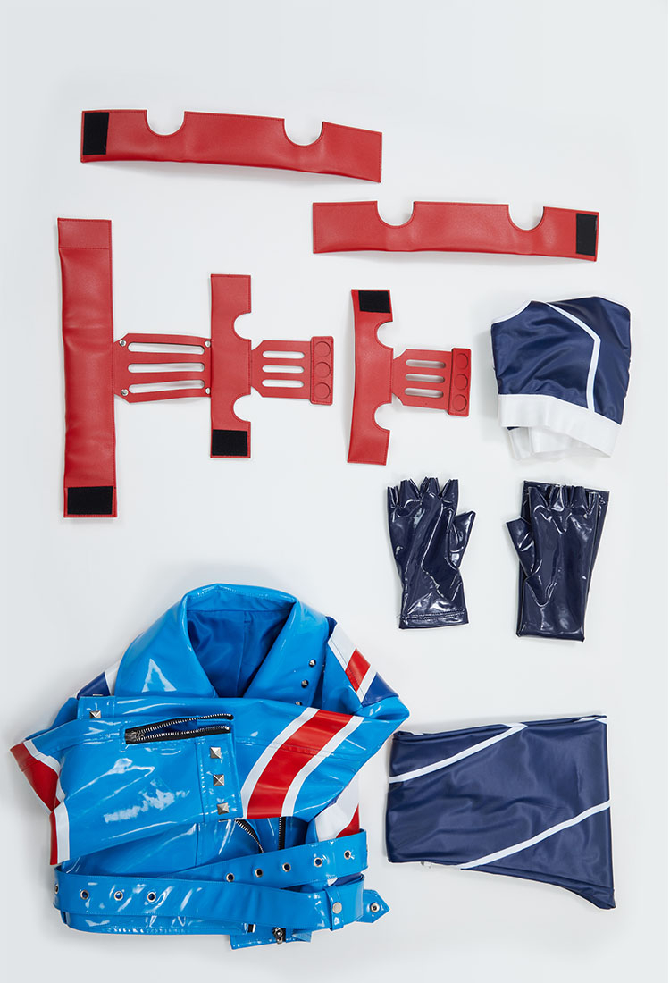 This Cosplay Costume captures Cammy's iconic look with a blue leather jacket with long sagging straps. Completing the outfit are red gauntlets with forearm protection on the right glove. Adorning her neck is a black choker with a Delta Red triangle emblem.