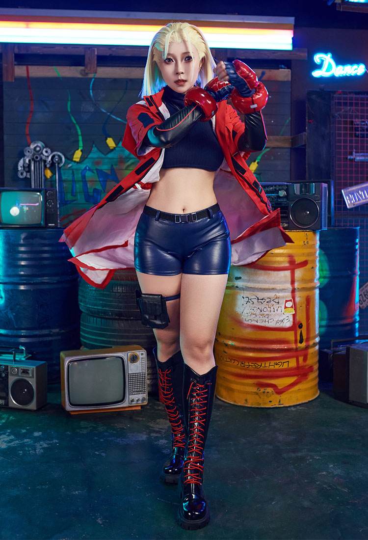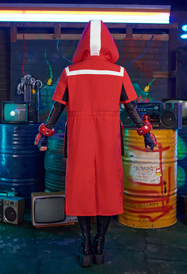 - The costume stays true to Cammy's official outfit3 with attention to detail including a striking red cloak-like trench coat with a hood, a black sleeveless crop top, a gold photo locket, and a black cycling shorts with a belt.