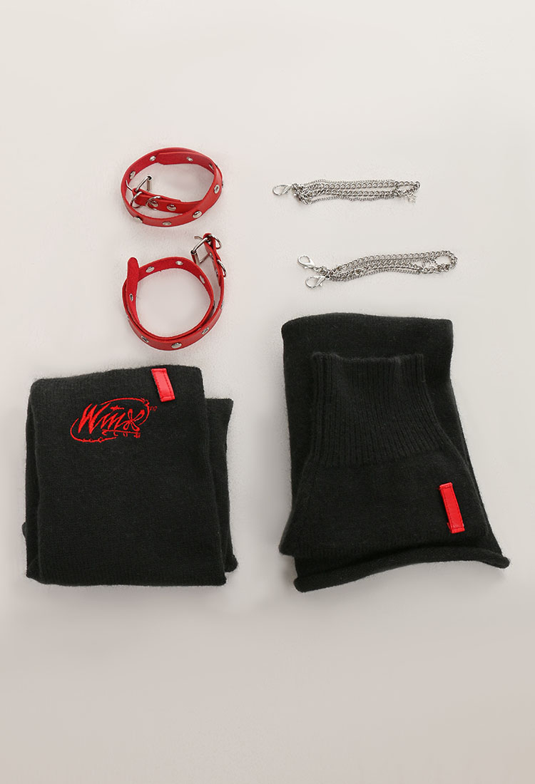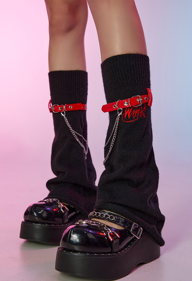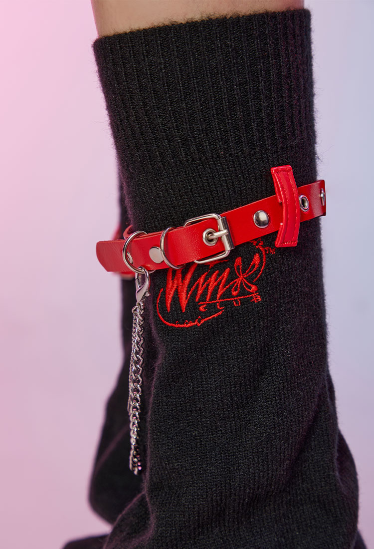 - Black Y2K leg warmers featuring contrasting black and red colorway, detachable red leather straps and metal chains, Winx Club embroidery logo on one side