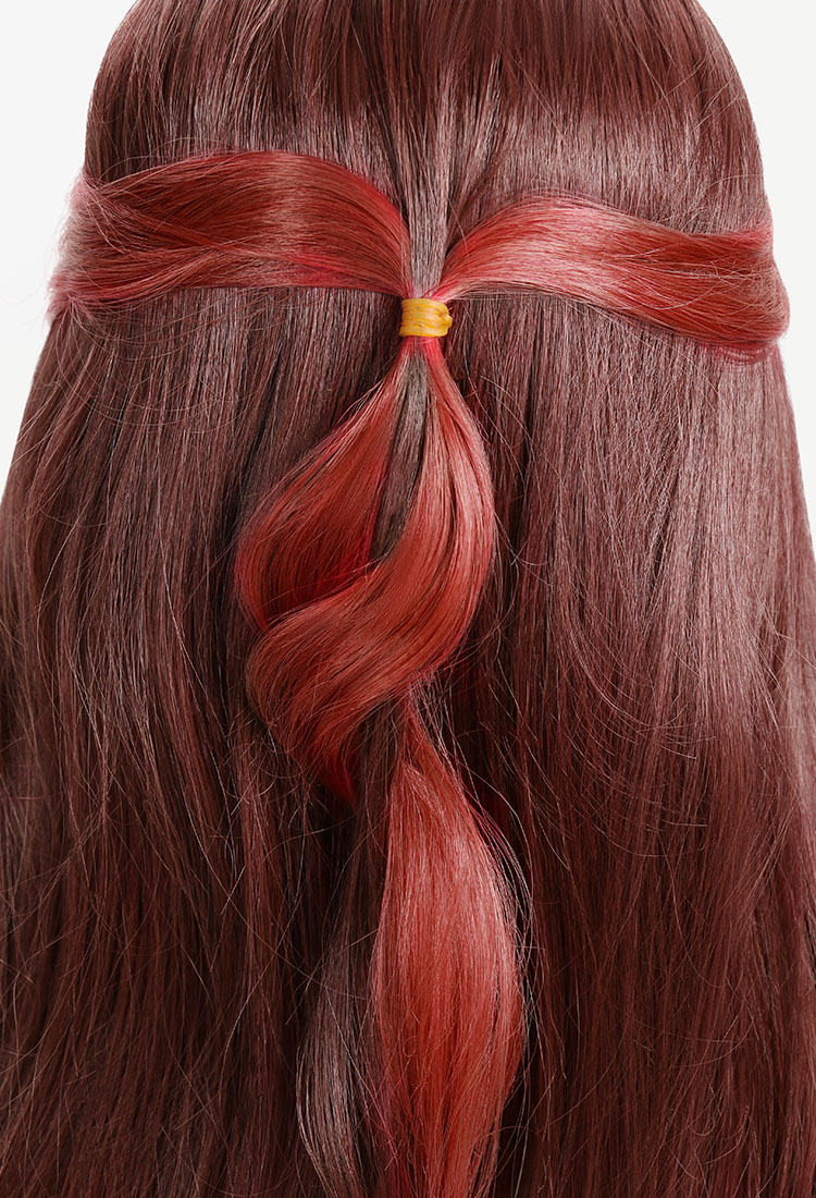 - Winx Club Layla Aisha wig featuring a red-brown color, middle apart red bang, half low ponytail