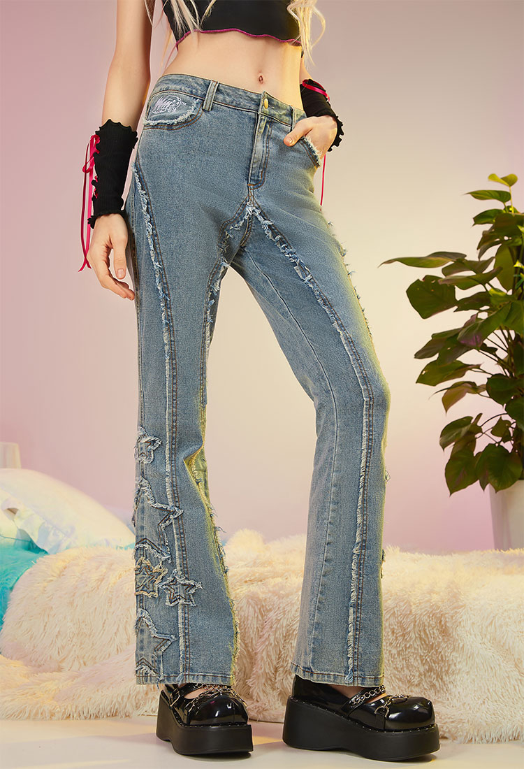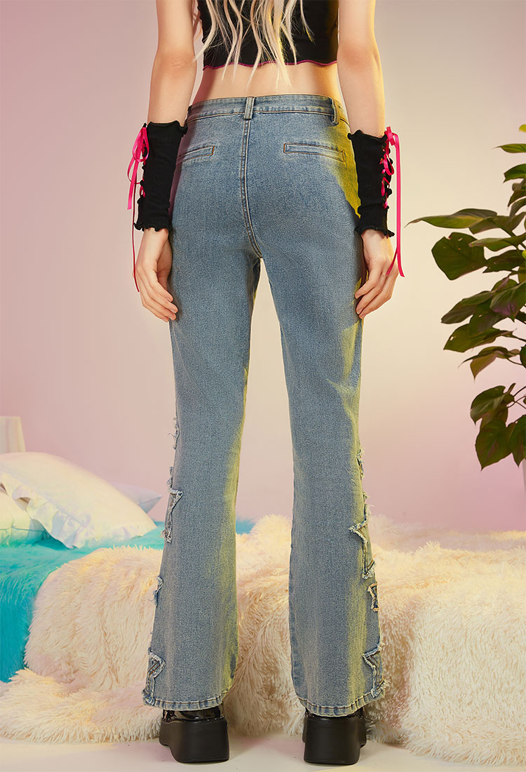 - Crafted with attention to detail, these jeans showcase a unique star design on both sides of the legs, adding a touch of charm and individuality to your outfit