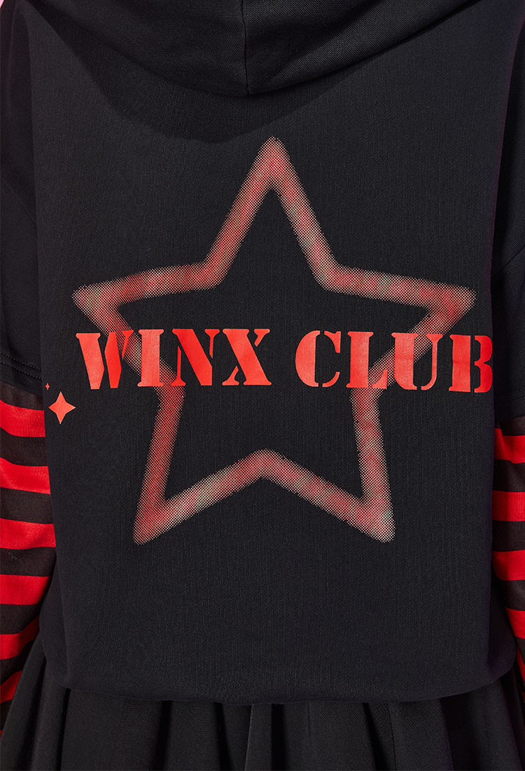 - This long-sleeved hoodie features a stylish black and red striped design, combining comfort and trendy fashion effortlessly. The standout feature of this hoodie is the Winx Club logo emblazoned on the back, adding a touch of magical charm to your outfit.