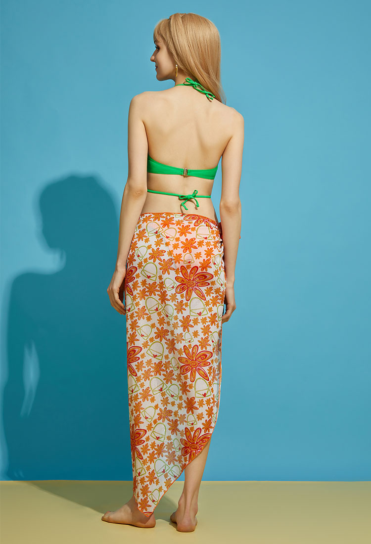 - Green Stella Bikini set featuring orange transparent gauze dress, which is ideal for decoration and sun protection