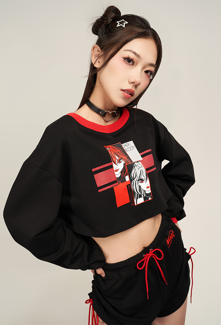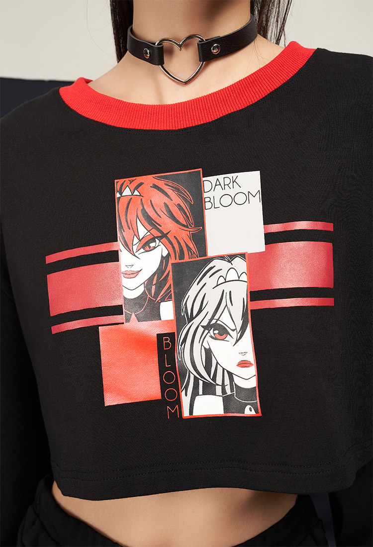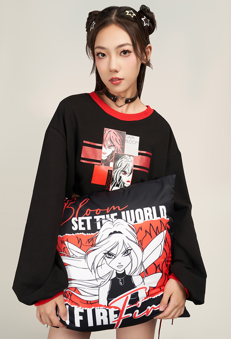 - This garment features a captivating pattern print that juxtaposes "bloom" and "dark bloom." Also, The combination of red and black colors enthralls the beholder.