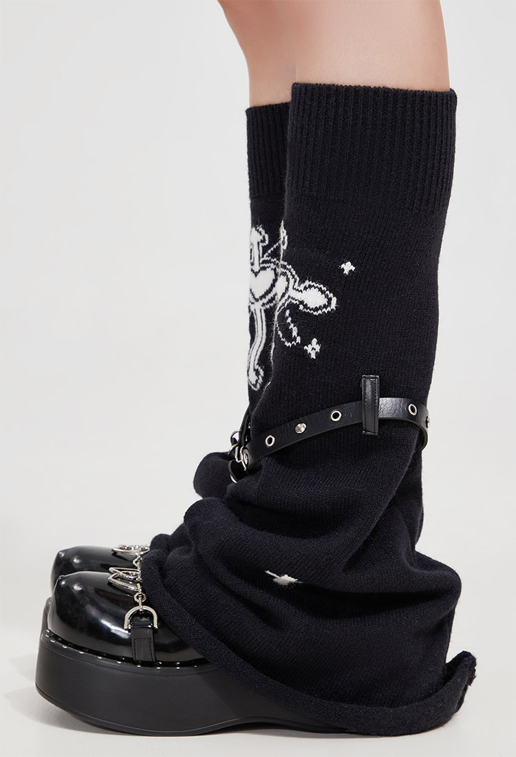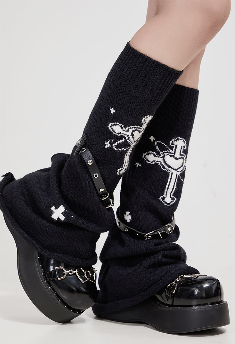 Women Black Harajuku Leg Warmers With Leather Harness And Cross Decoration