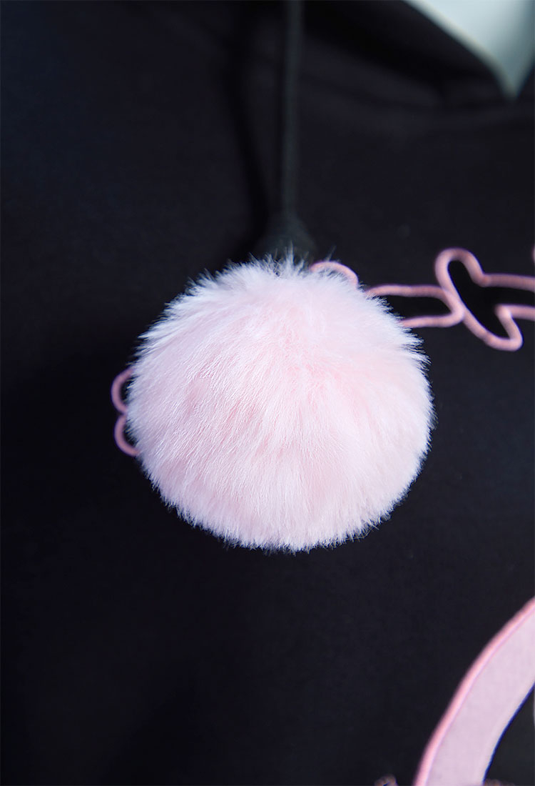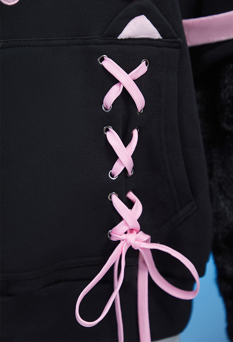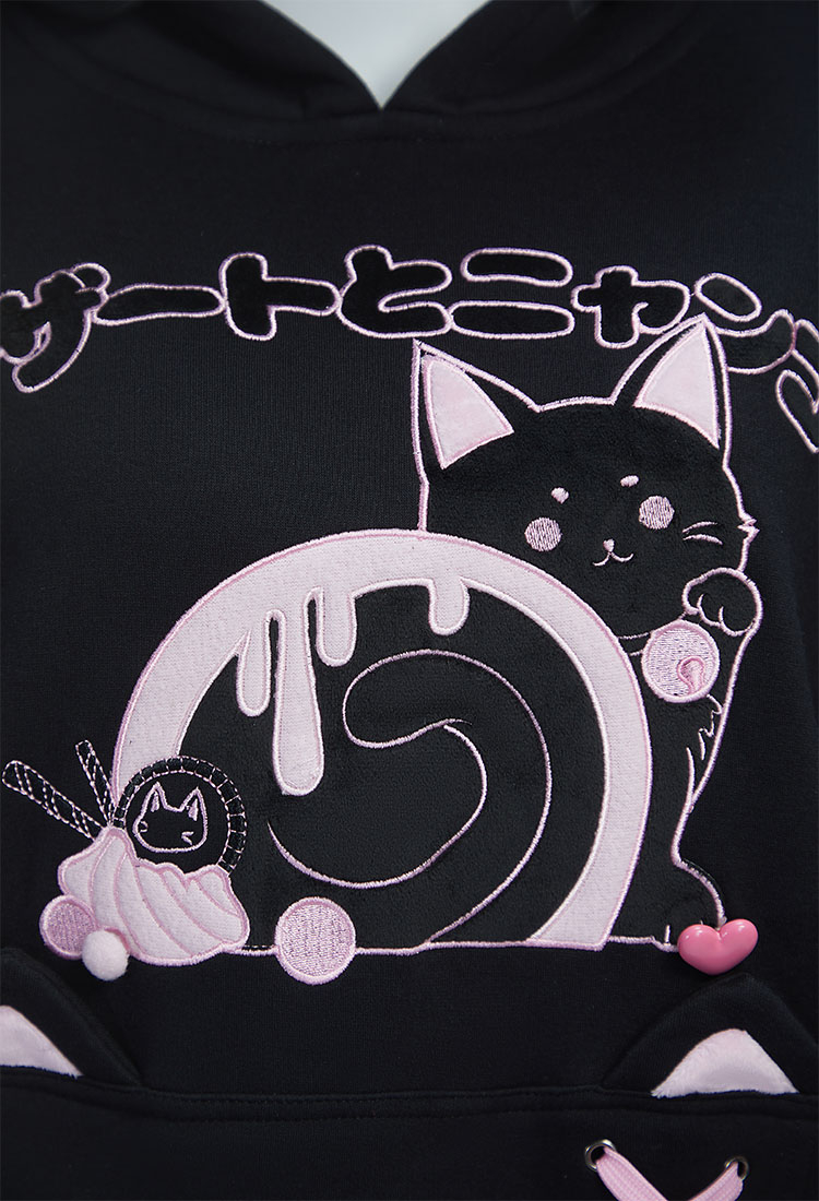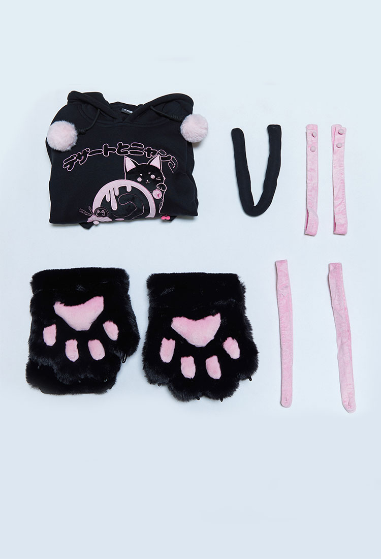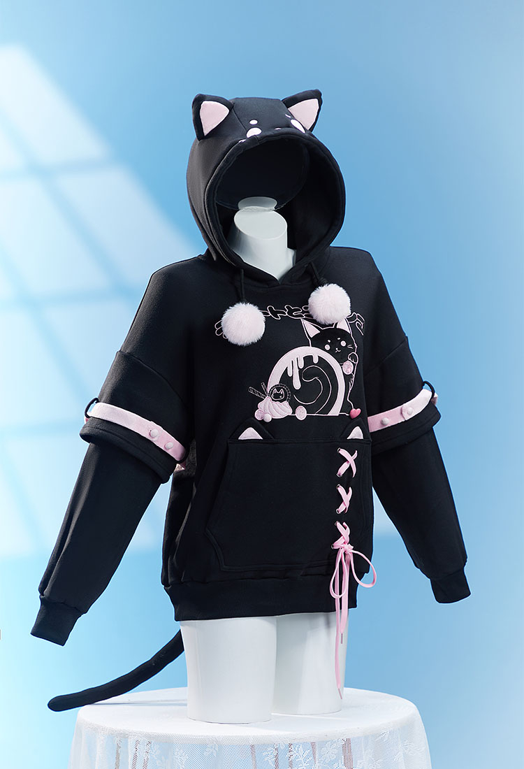 Inspired by the playful charm of a dessert cat, this adorable hoodie blends cozy comfort with kawaii style. Crafted from soft sweatshirt fabric, it features embroidered dessert-cat artwork, fluffy detachable paw gloves, ribbon lace-up details, and cat-ear hood with pom-poms. Perfect for daily wear, cosplay, or casual outings.