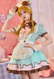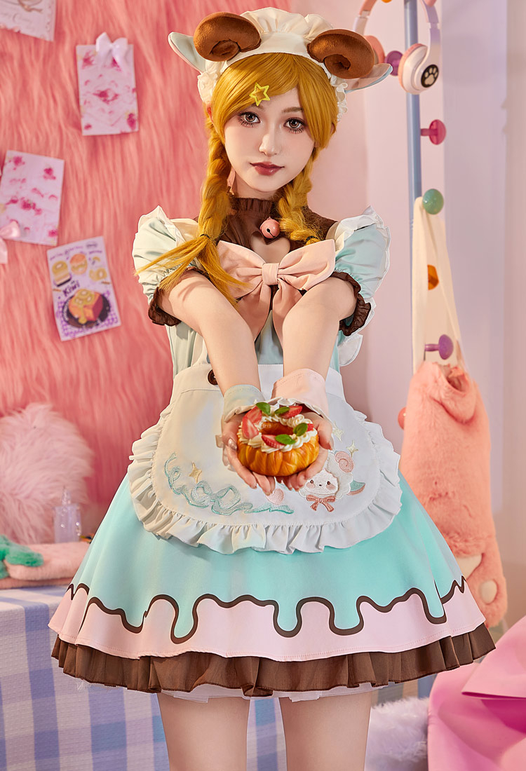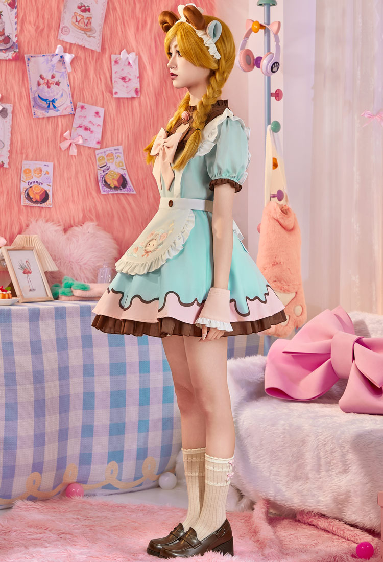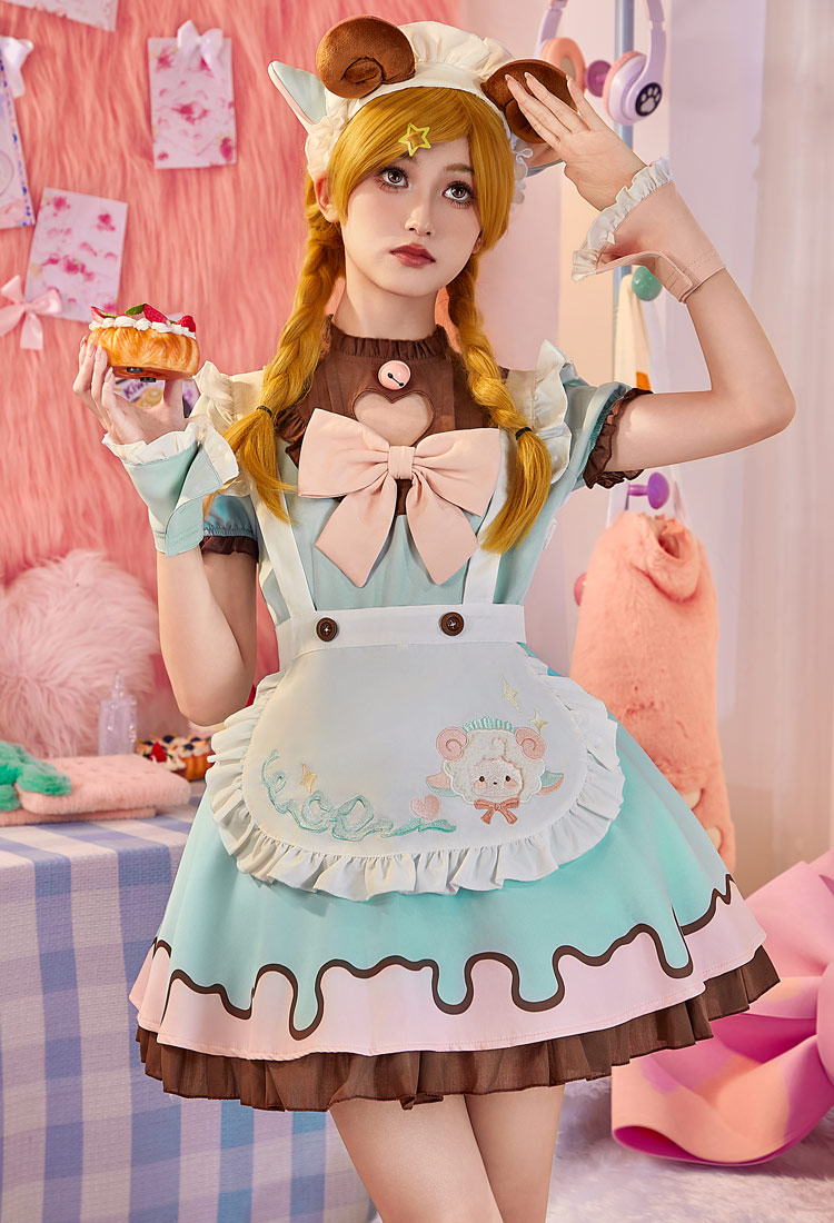Adorably designed in pastel blue and pink with chocolate-brown accents, this maid dress features a chest cut-out with delicate embroidery, a detachable cute apron.