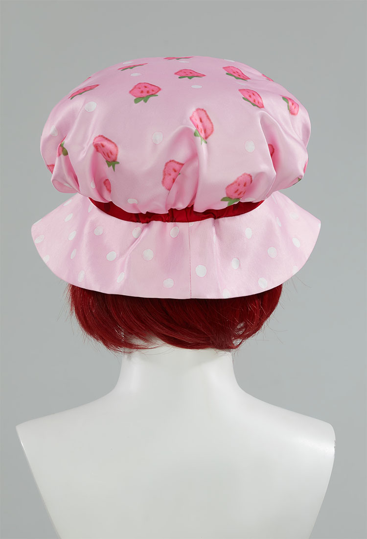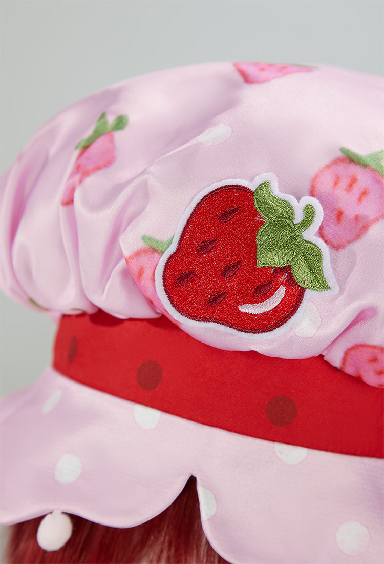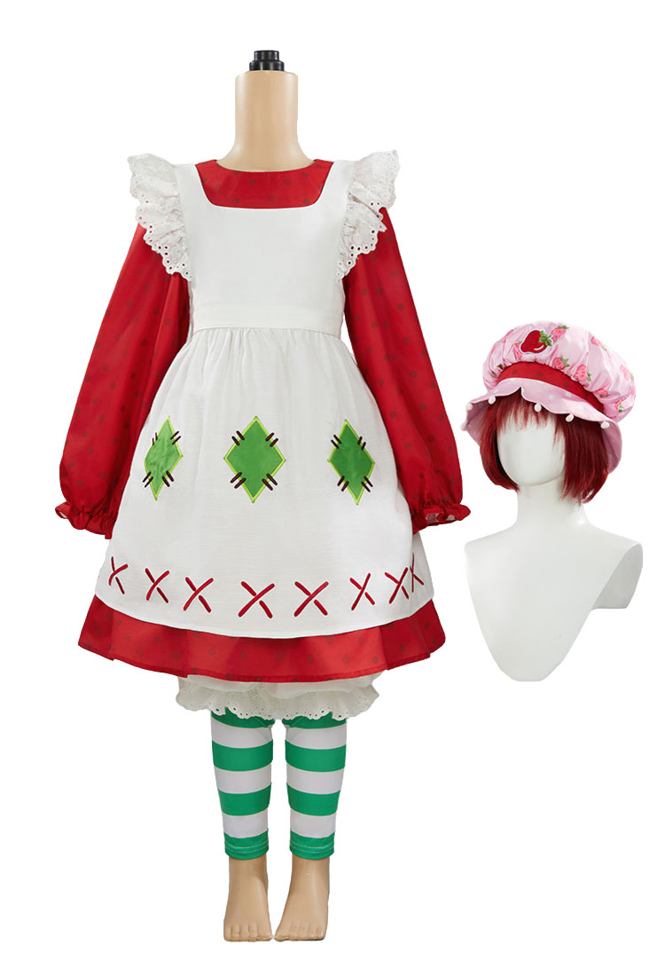 - The look is completed with green-and-white striped leggings and a soft pink bonnet-style hat adorned with a strawberry motif. The set includes everything needed to recreate Strawberry Shortcake’s iconic look, perfect for Halloween, cosplay events, theme parties, or dress-up play.