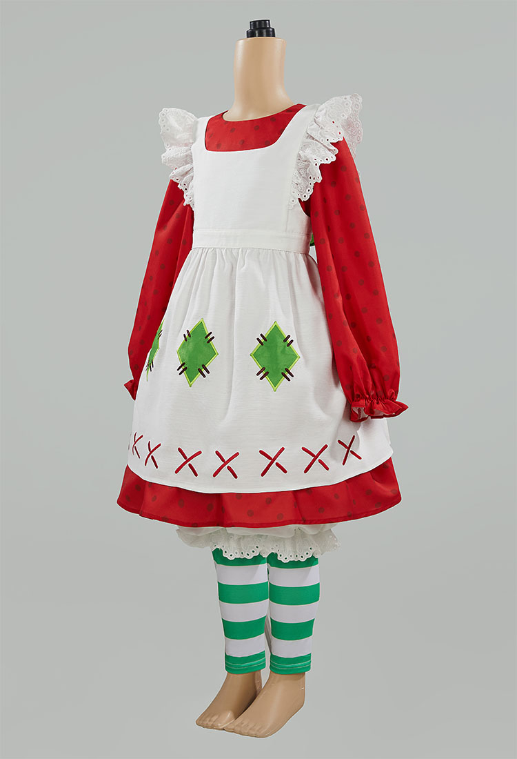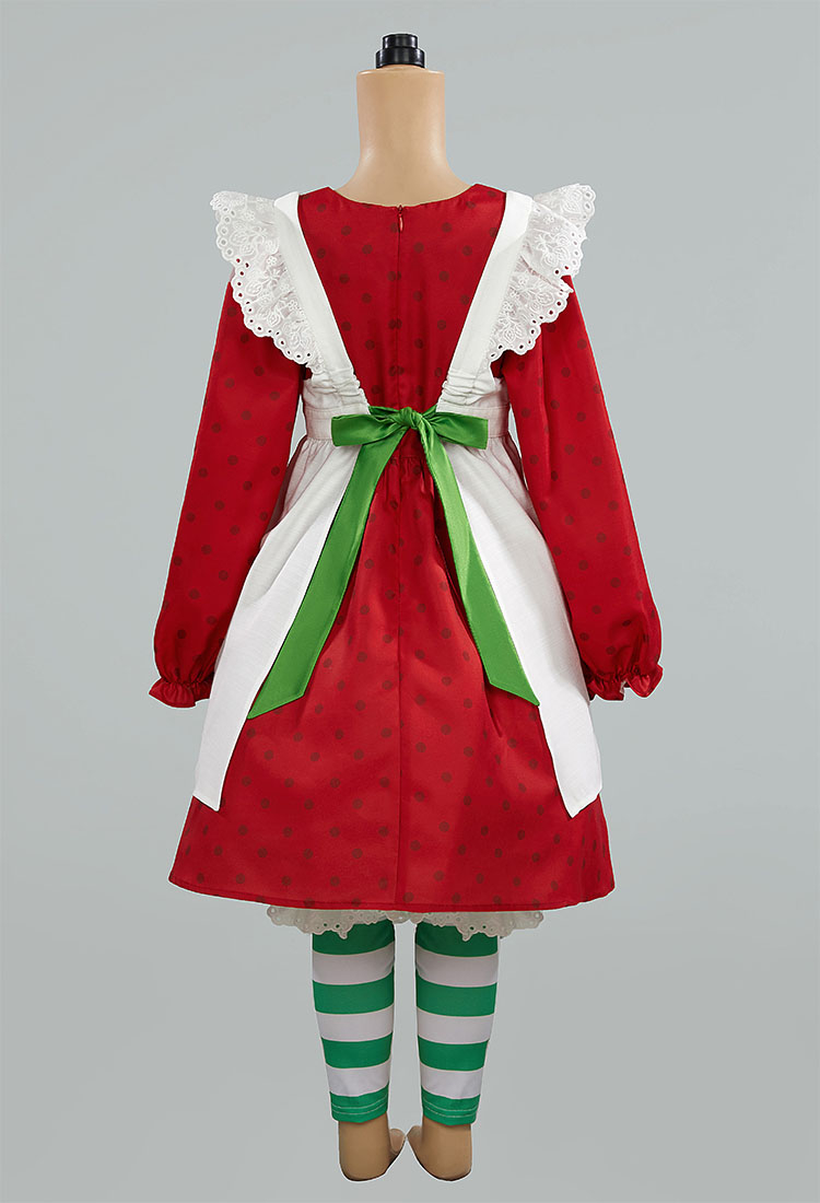 - Step into a sweet slice of nostalgia with this adorable Strawberry Shortcake Kids Cosplay Costume Set! Designed for little fans of the classic character, this outfit features a charming red dress with puff sleeves, a white pinafore apron with green patch details, and decorative red “X” stitching at the hem for that vintage cartoon feel.