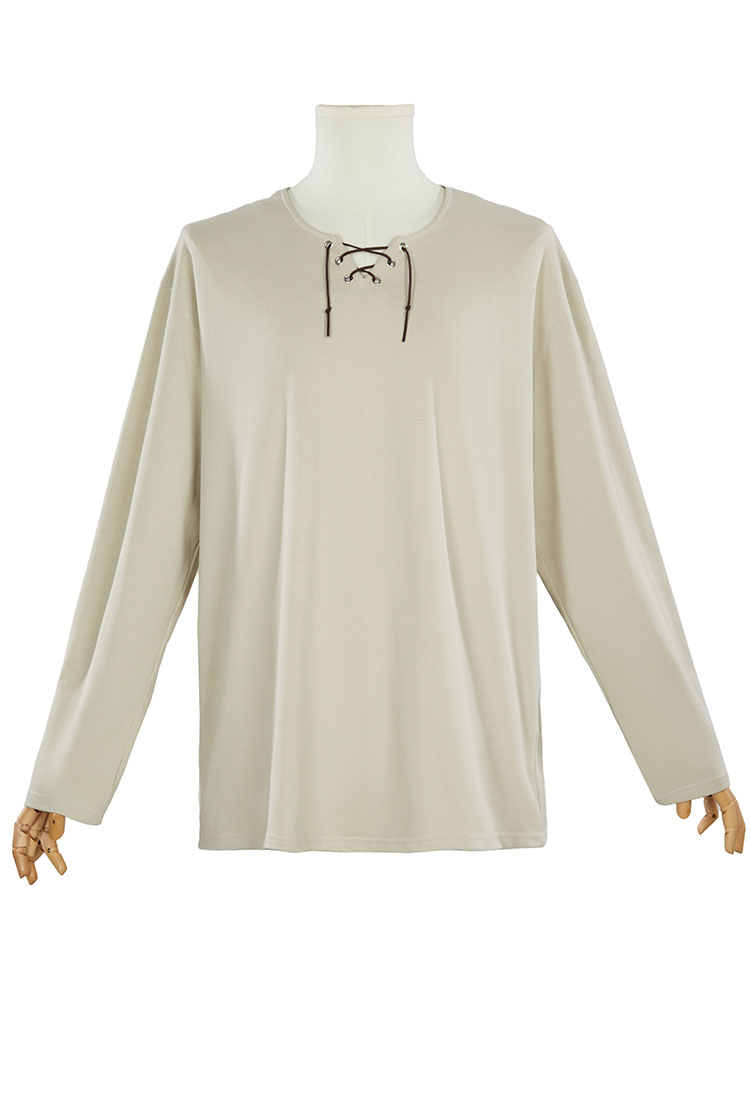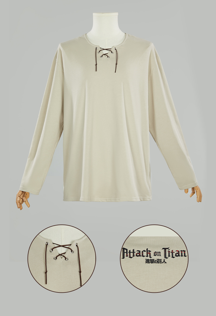 - Channel the look of your favorite soldiers from Attack on Titan with this minimalist long-sleeved T-shirt. Inspired by the Survey Corps’ base layer uniform, this beige top features a lace-up neckline with black cord detailing, making it perfect for casual cosplay or everyday wear.