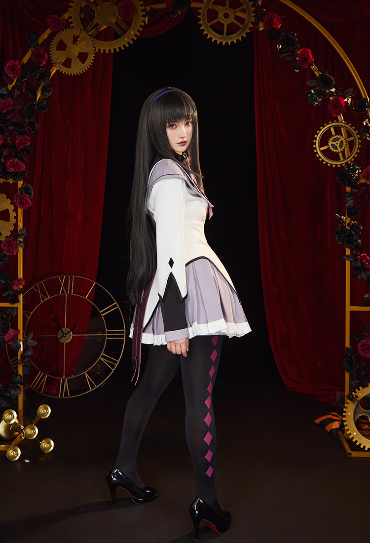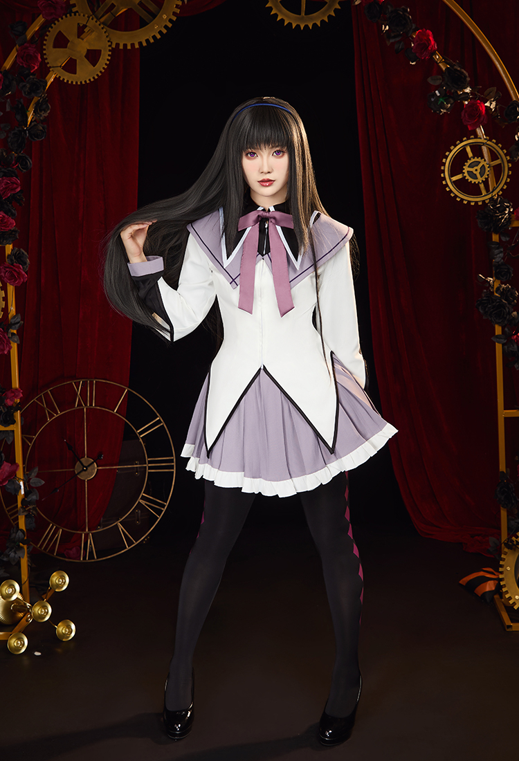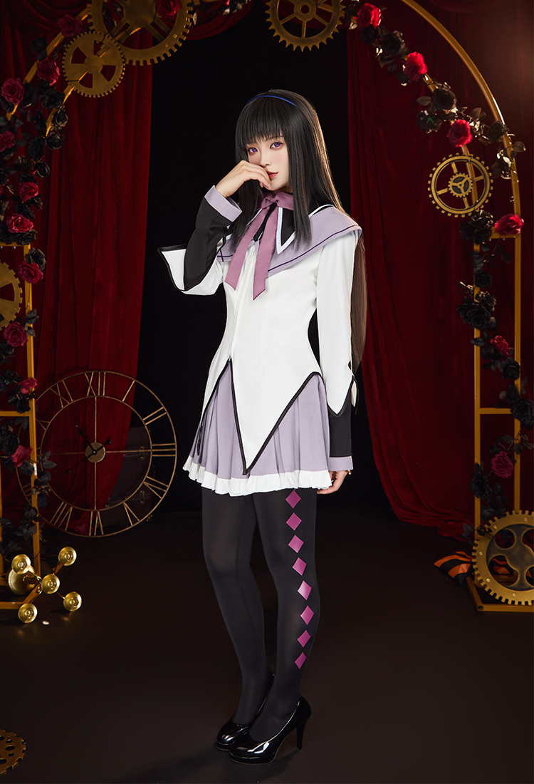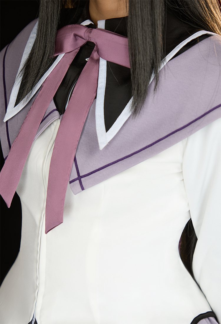 Step into the mysterious charm of Homura Akemi with this Officially Licensed Puella Magi Madoka Magica Cosplay Costume Set. Featuring a delicate sailor collar with embroidered white diamond cutouts, this costume highlights every detail of Homura’s iconic look.