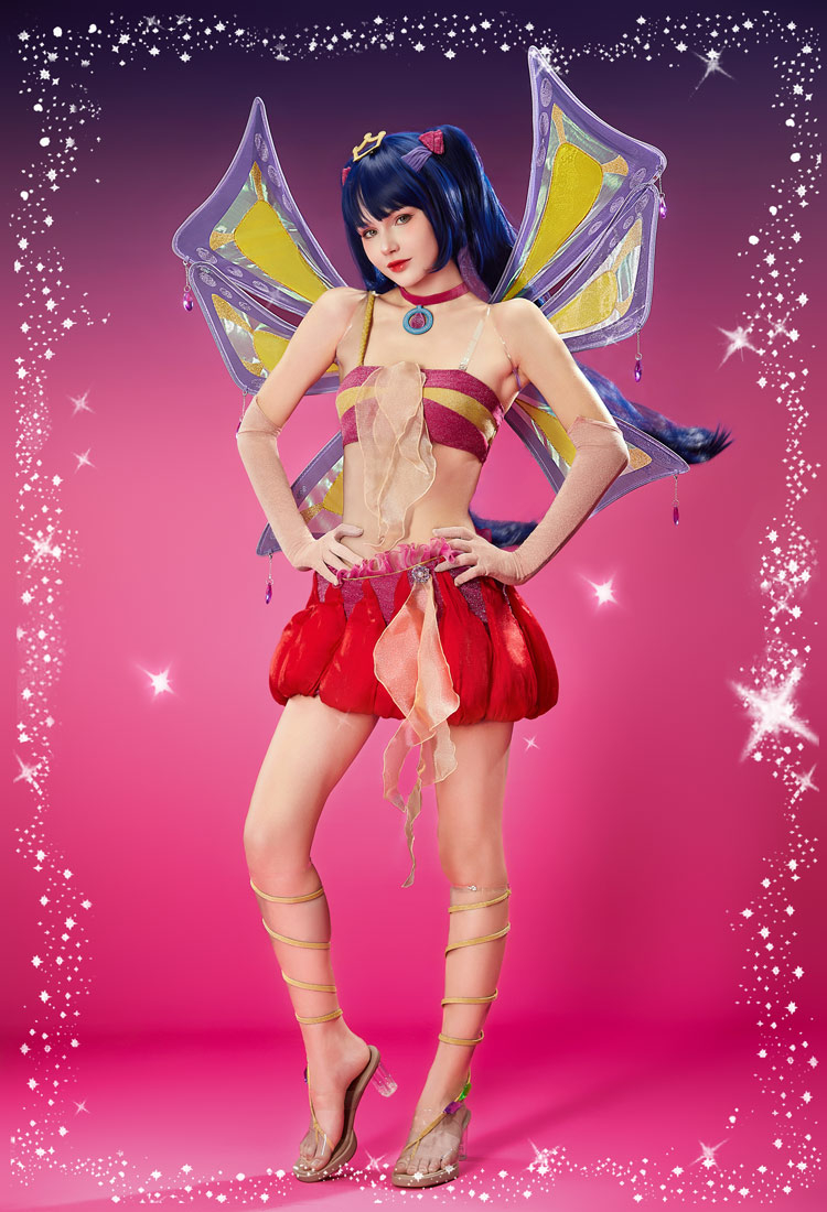 Transform into Musa with this dazzling Enchantix cosplay costume! Crafted with a mix of shimmering fabrics for a glamorous look, the dress is padded with cotton to create a voluminous, three-dimensional skirt shape. The highlight is the custom-designed wings, which can be worn front or back with adjustable straps. Beaded wing details are detachable for easy storage. Every detail reflects Musa’s enchanting style, making it perfect for conventions, performances, or collectors.