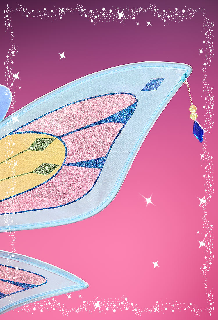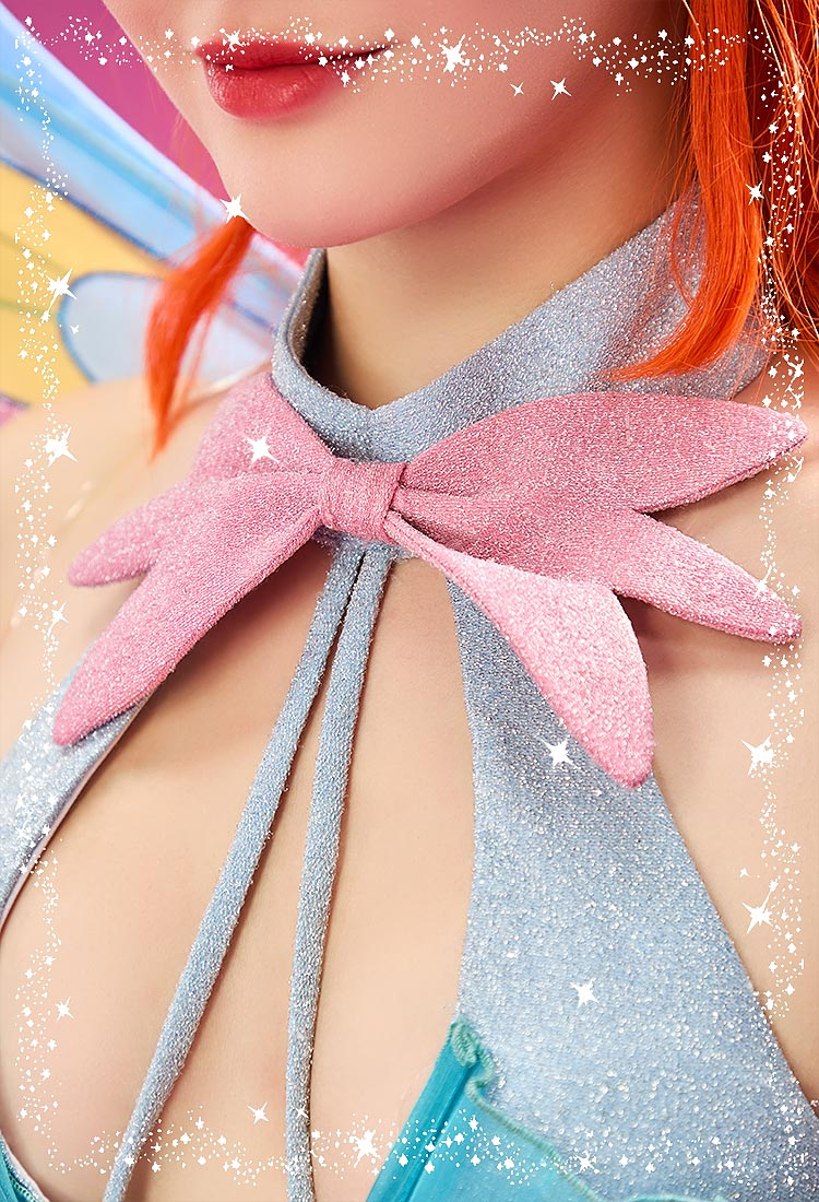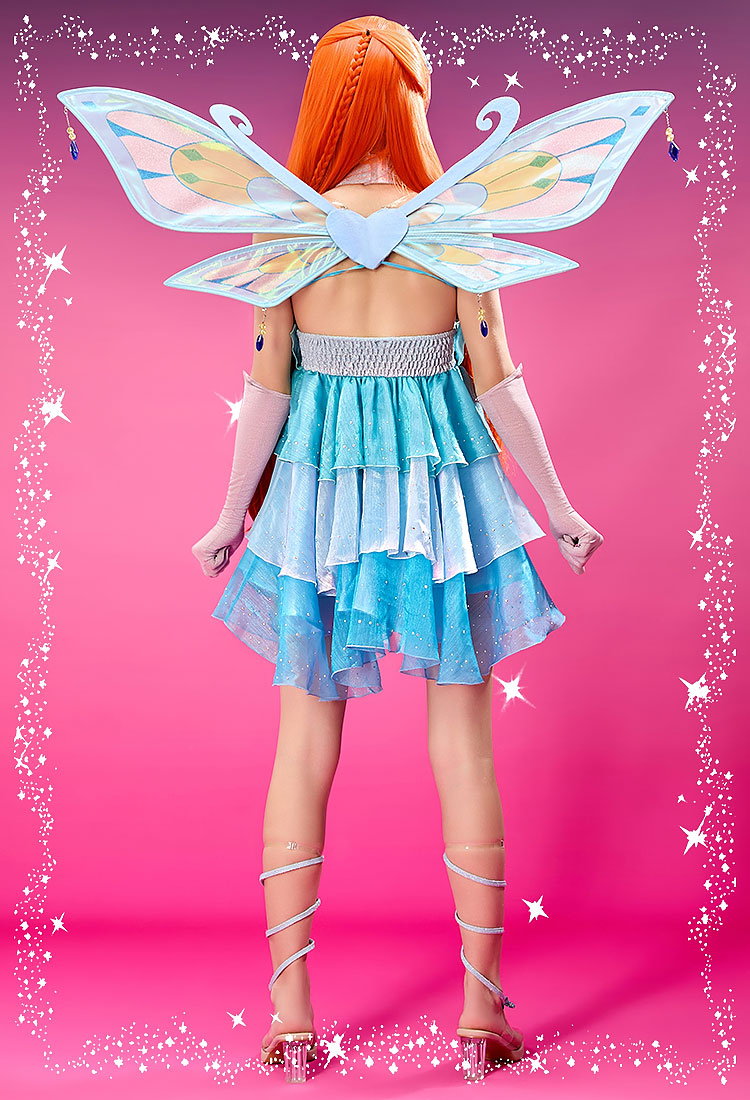 Shine like Bloom with this enchanting Enchantix cosplay costume! The dress is made with stretchy glitter fabric for a magical sparkle, featuring a three-layered skirt adorned with delicate rhinestone detailing. A finely crafted metal chest accessory, matching bow, and leg bands ensure accurate character restoration. The set also includes beautifully designed wings to complete Bloom’s iconic Enchantix look. Perfect for conventions, stage performances, or collectors seeking authenticity and elegance.