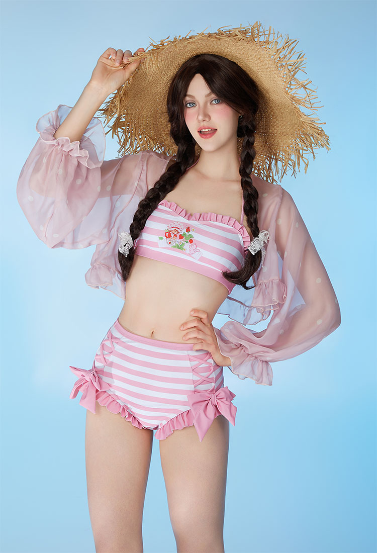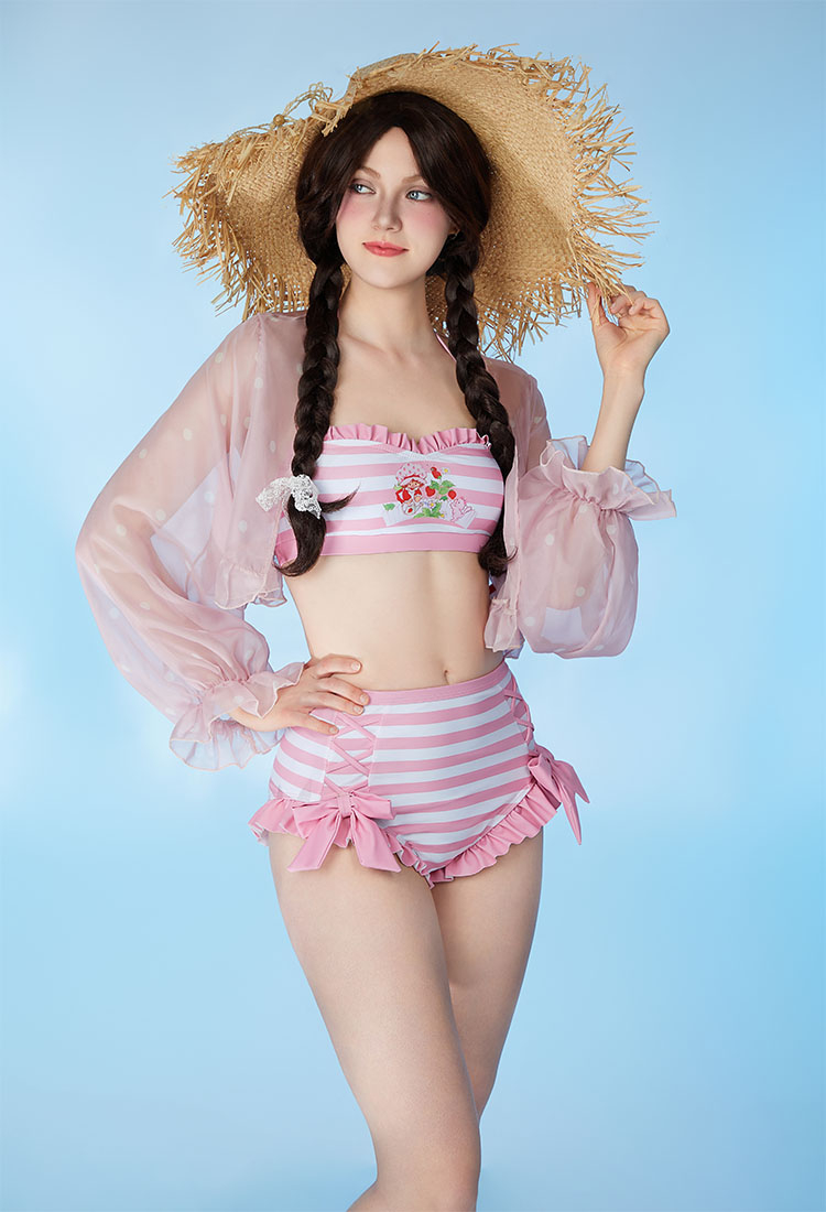 - Step into Strawberryland with this officially licensed Strawberry Shortcake Pink Stripes Two-Piece Swimsuit Set, featuring a retro-inspired design that’s perfect for sunny days. The set includes a matching sheer strawberry polka dot chiffon cover-up, adding a touch of playful elegance to your summer wardrobe.